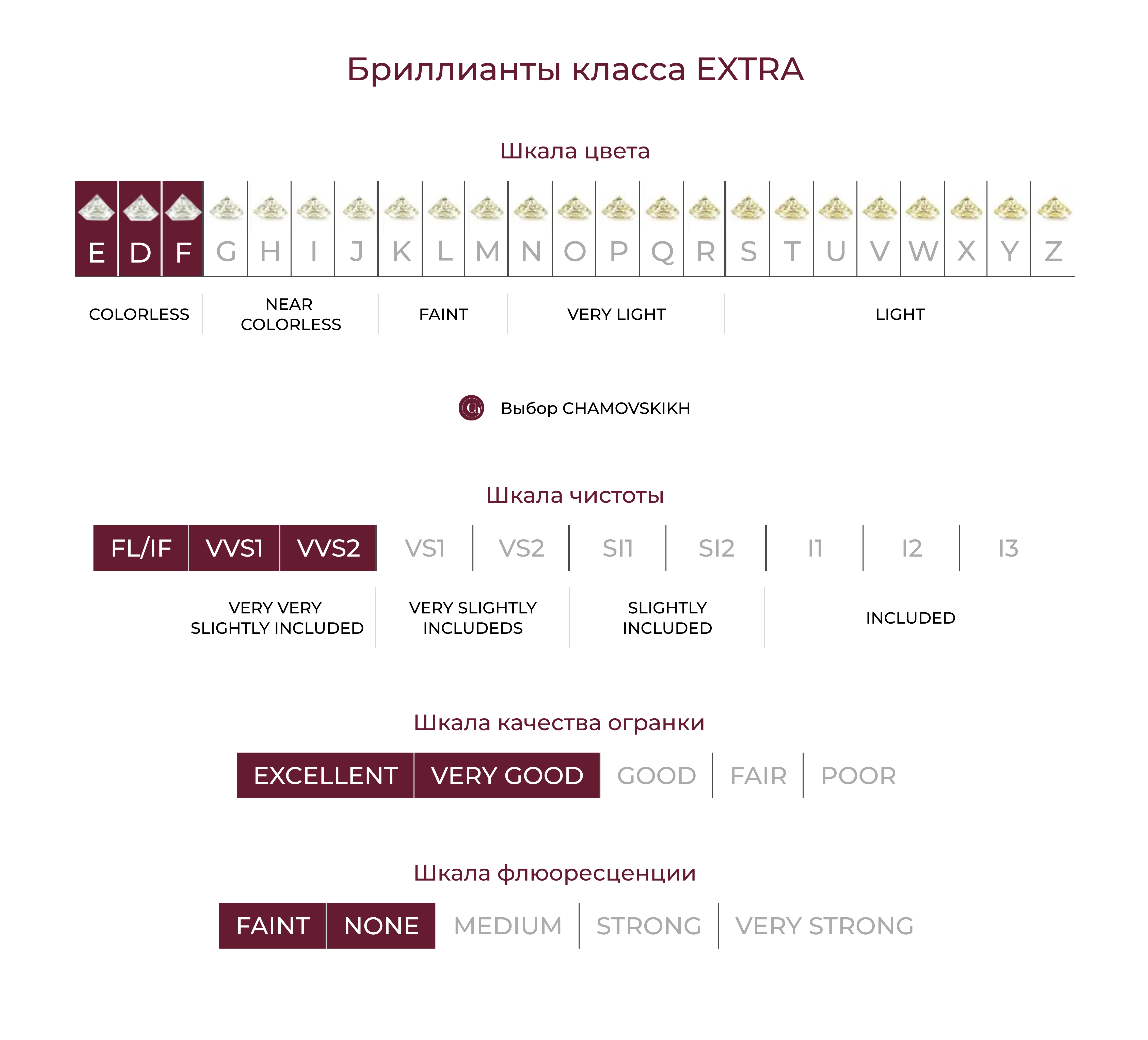 При отборе бриллиантов эталонных характеристик, ювелирный дом CHAMOVSKIKH полагается на международную систему оценки бриллиантов – 4С, разработанную Геммологическим Институтом Америки GIA, и на российскую систему оценки бриллиантов.