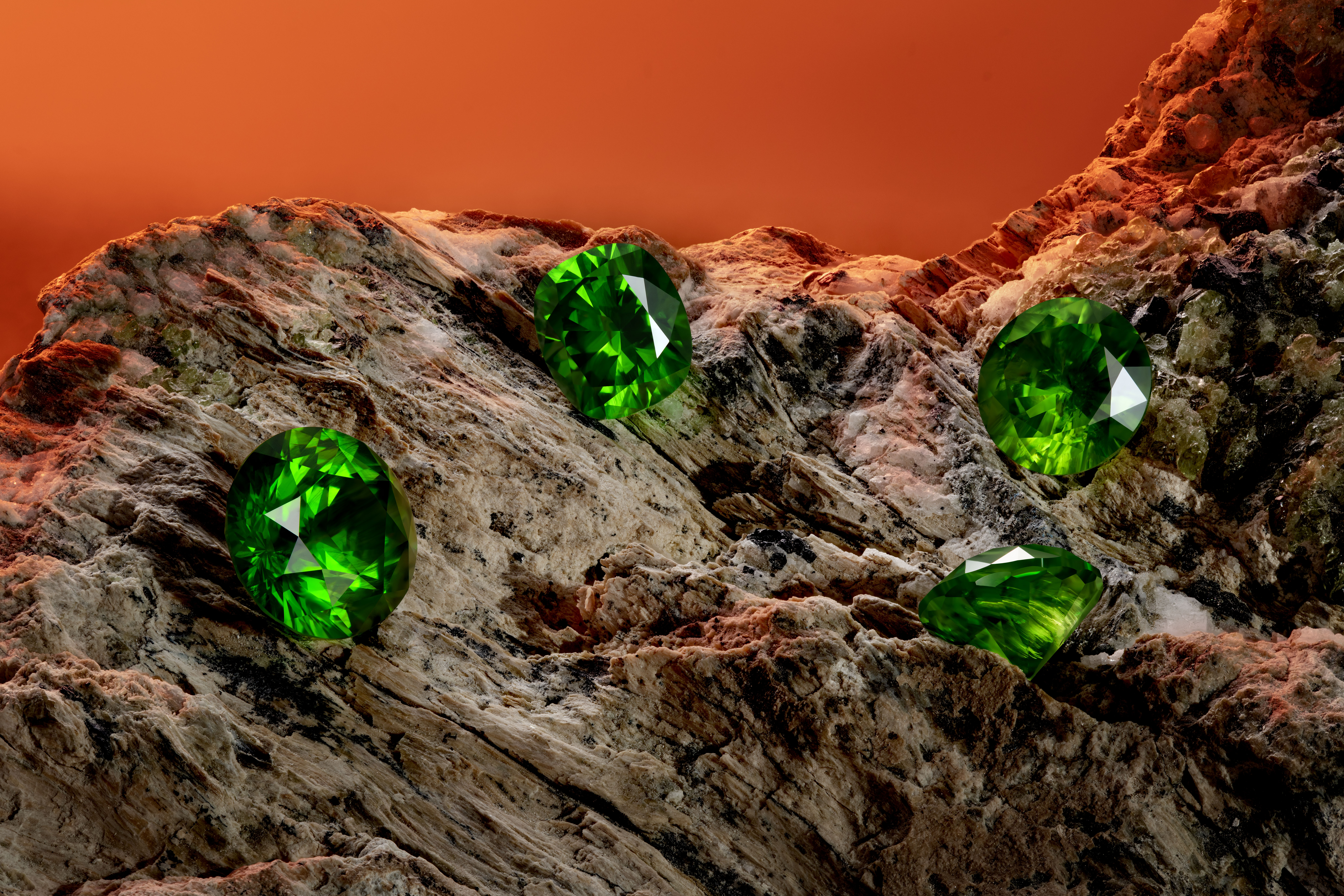 Контраст оранжевой палитре составит другая группа гранатов – сочные зеленые демантоиды. Яркий самоцвет, герой сказок Бажова и повести Куприна, был обнаружен в середине XIX века в деревне Полдневская на Урале. Зеленый гранат вторит своему оранжевому собрату: проявляет сильную дисперсию (0,57) и цветовую игру, опережая в этом показателе даже бриллиант. За свое свойство камень получил титул «алмазоподобный». Интересно, что демантоид способен раскрыть свою игру и цвет только лишь в эталонной огранке «круг», или по-другому – Russian Cut, фантазийные формы не смогут передать завораживающее очарование камня.