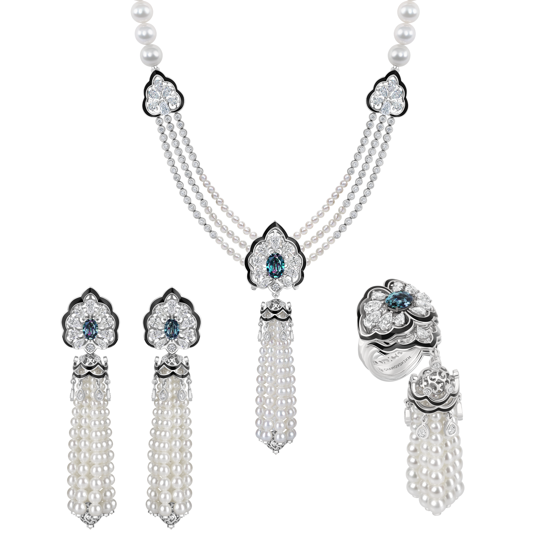 Александриты, представленные в парюре, имеют округлые контуры и вес от 0,8 до 1,5 карата. Более 120 бриллиантов создают в композиции динамику и выразительность. Жемчуг, выбранный для подвесных элементов украшений, придает невероятную степень невесомости эффектному колье, серьгам и кольцу, воплощая идеально сбалансированную эстетику парюры. Изящные кисти в каждой драгоценности отсоединяются, открывая простор для перевоплощений.