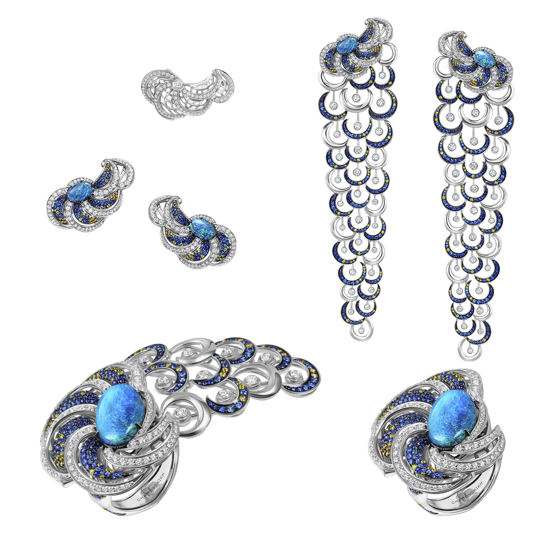 В центре серег и кольца – австралийские черные опалы с бирюзовым отливом. Подвижные части - многослойные золотые перья с контрастной инкрустацией бриллиантами и сапфирами - подчеркивают красоту редкого оттенка самоцвета.