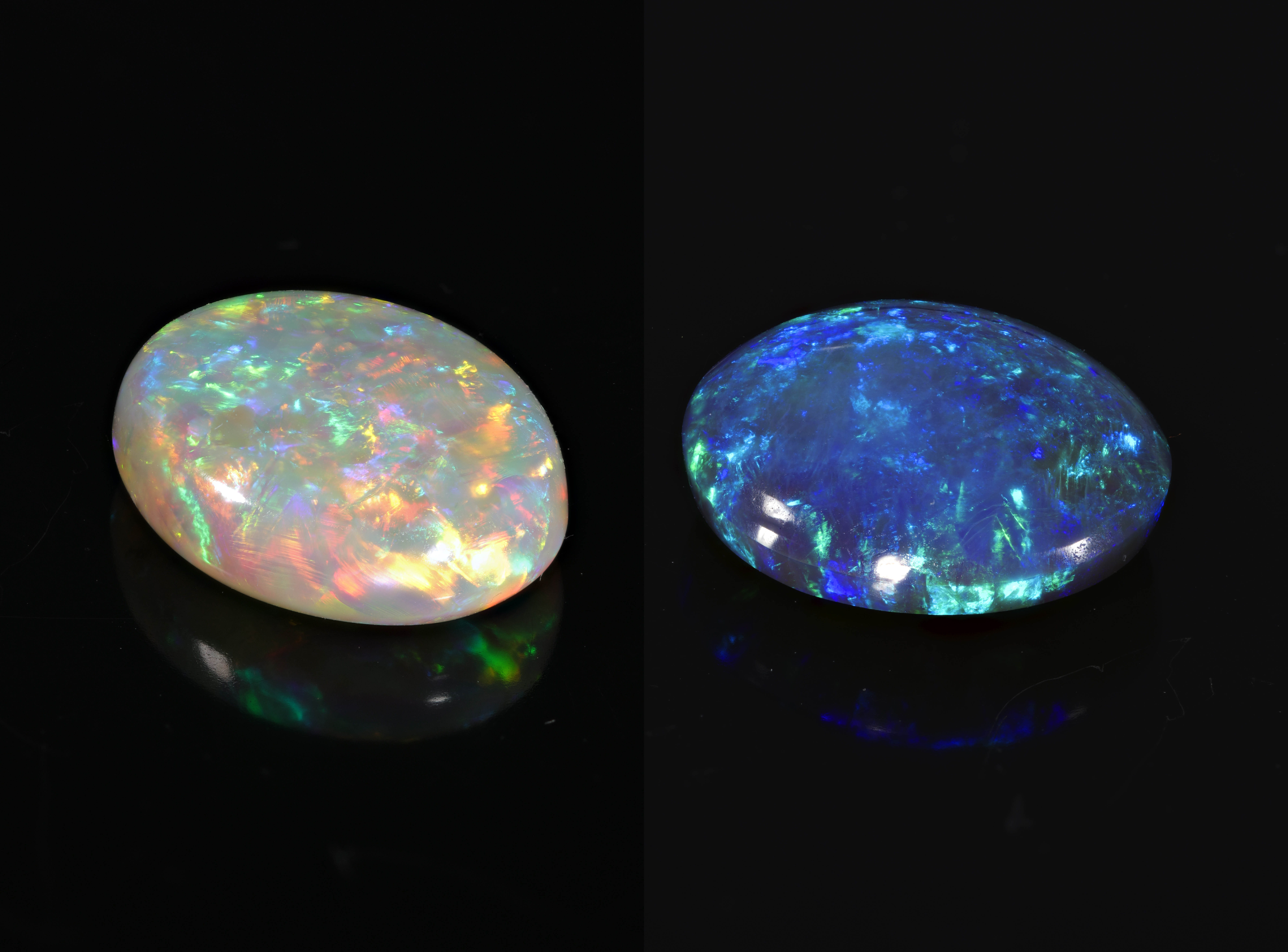 Среди благородных опалов выделяют черный и белый опалы. Белый опал полупрозрачный, имеет светло-голубые и молочно-белые тона. Игра цвета в белом опале проявляется в виде нежного радужного сияния. В зависимости от его выразительности формируется цена на камень.