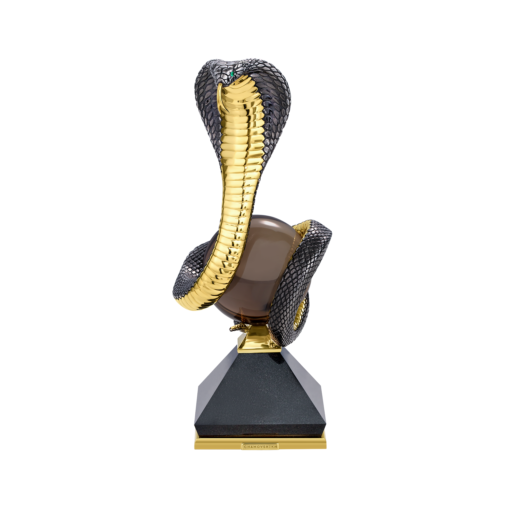 Королевская кобра — символ мудрости и власти. Статуэтка, выполненная из серебра, достоверно передает завораживающую пластику. Покрытие рутением акцентирует фактуру змеиной кожи и придает образу особую выразительность. Гипнотизирующие зрителя глаза «Кобры» инкрустированы природными изумрудами. Золочение 999-й пробы напоминает о связи змей с земной стихией, открывающей путь к богатствам мировых недр.