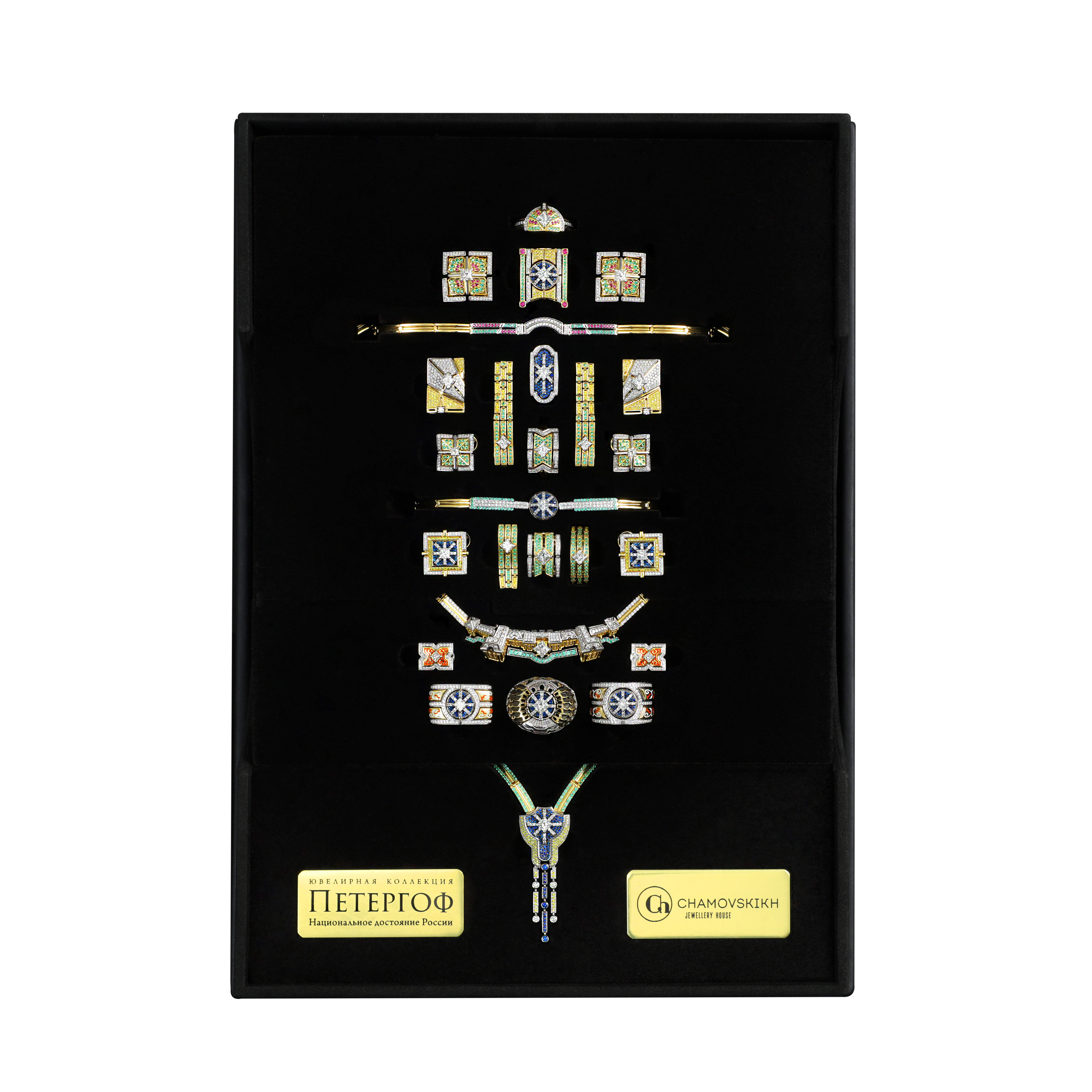 Двадцать элементов гарнитура повторяют план царской резиденции. Роскошная миниатюра отлита в белом и желтом золоте 750-й пробы. Колористическое решение, продиктованное драгоценными камнями: бриллиантами, рубинами, изумрудами и сапфирами, а также яркими оттенками нанокерамической эмали, подчеркивает парадное великолепие садово-паркового ансамбля. Тонкая ажурная резьба оборотной стороны украшений, так называемой «подпайки», восходит к великолепию отделки парадных интерьеров резиденции русских царей.