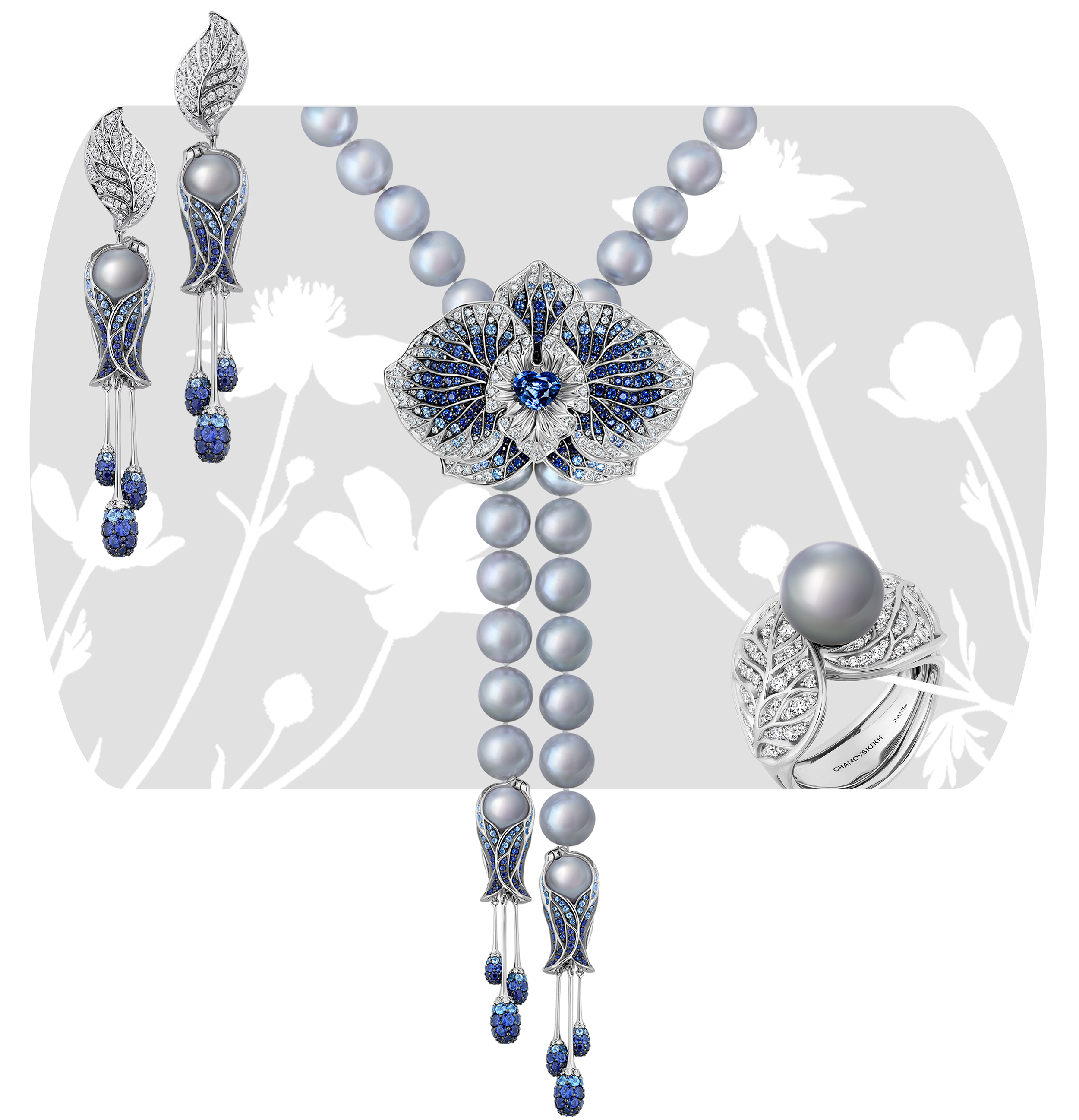 Парюра L’amour de ma vie – ювелирное воплощение цветущей орхидеи. Художники Дома Chamovskikh поставили перед собой амбициозную задачу отразить в украшении сердечное признание самому дорогому человеку. Так нежные бутоны обрели концептуальное значение. Изысканное сочетание бриллиантов и сапфиров синего цвета отражает красоту распустившихся лепестков. Притягательный сапфир огранки «сердце» в центре добавляет теплоты и сияния драгоценной композиции. Роскошные аксессуары сета наделены свойствами трансформации, превращаясь в разные по сложности изящные конструкции.