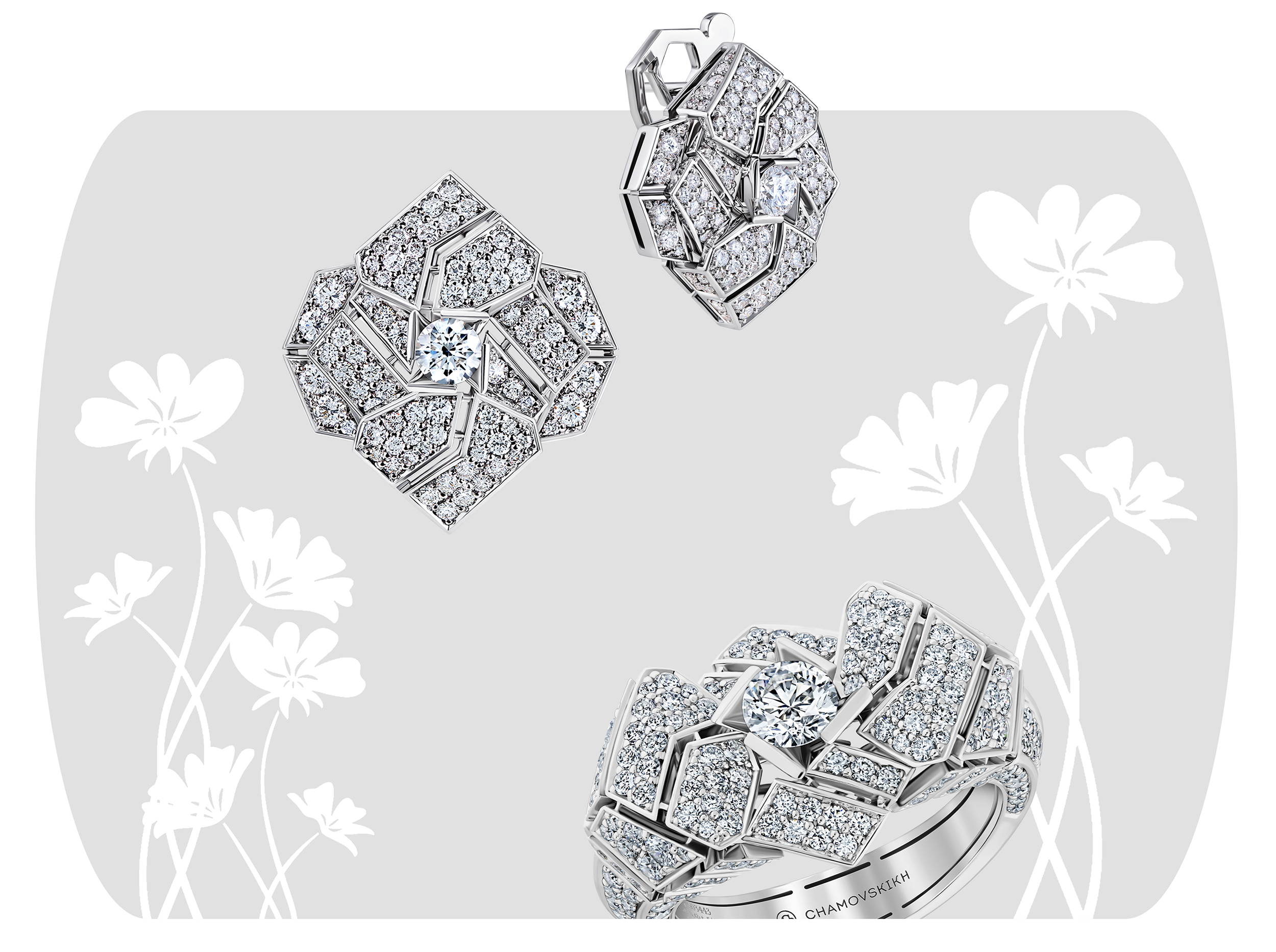 Цветок – истинное воплощение эфемерной красоты природы и ее совершенства, интерпретируемый в ювелирных произведениях самыми разными способами. Украшения Дома CHAMOVSKIKH, вдохновленные флорой, отражают не только реализм с его лаконичностью в простоте линий, но и абстрактное выражение ботанических форм, уверенно заявляя, что тема природы далека от обыденности.
