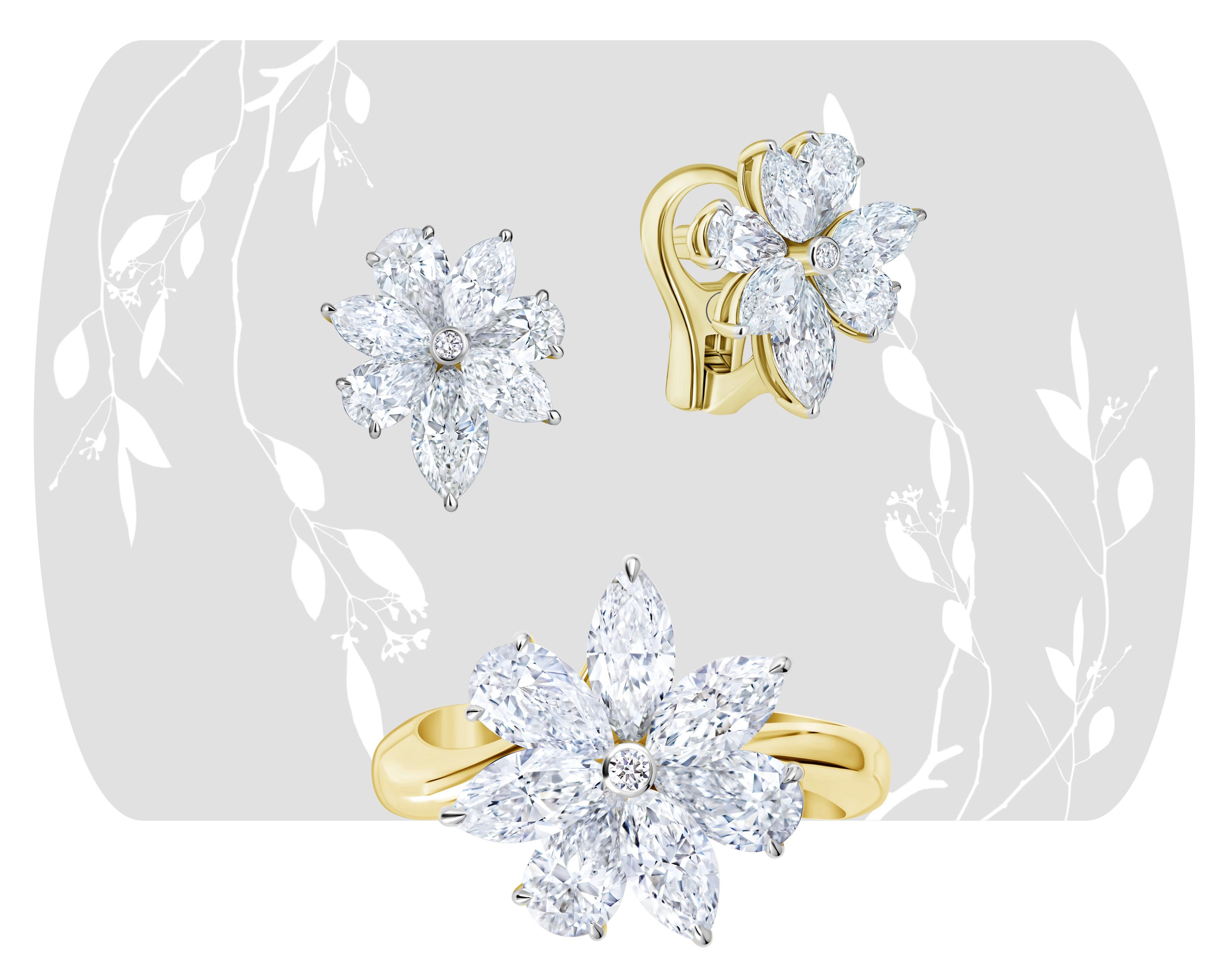 Бриллиантовый сет фантазийной формы из коллекции Flora выполнен в стилистике ар-деко — украшения сета объединяют утонченные классические черты с авангардным решением, которое воспроизводит красоту цветов в идеальном равновесии между оригинальностью и гармонией. В серьгах и кольце 430 бриллиантов выложены в геометрические, словно трехмерные, фигуры, призывая воображение представлять кристаллы льда на нежных лепестках соцветий.