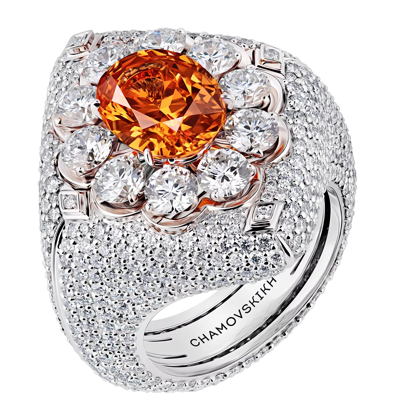 В активе ювелирного дома CHAMOVSKIKH находятся спессартины топовых характеристик. Исключительные оптические свойства: неповторимый оранжевый цвет и кристальная чистота — максимально проявлены в изысканных украшениях.
