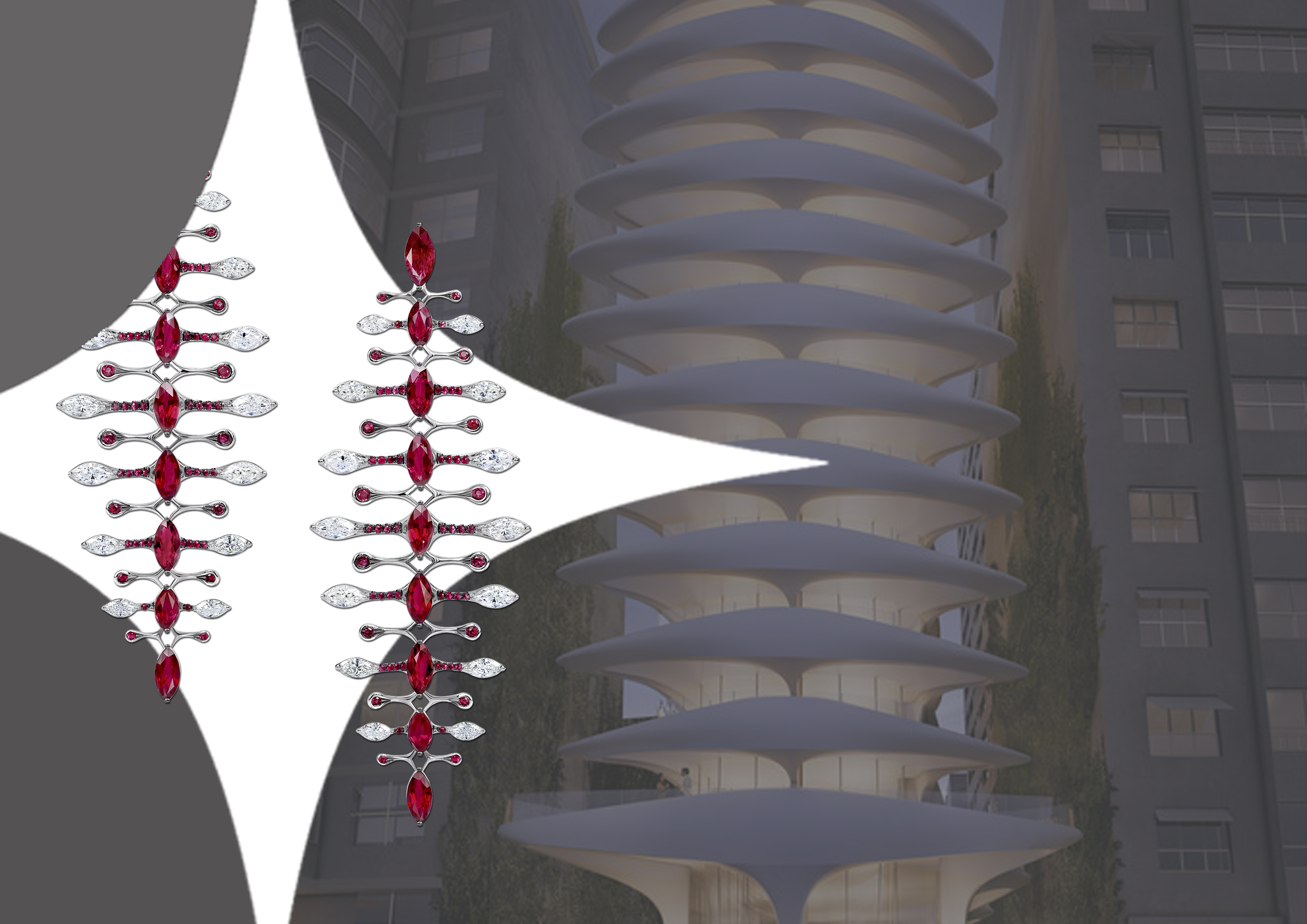 В ювелирной коллекции читается тот же плавный изгиб линий, та же выразительная форма, но выраженная в миниатюре. Серьги представляют собой бионическую конструкцию с симметричным расположением драгоценных элементов относительно центральной оси. Невероятно сложная техника закрепки рубинов и бриллиантов позволила создать впечатляющее ювелирное произведение, словно наполненное светом и воздухом. Форма украшения удивительно точно напоминает фасад бразильской резиденции Casa Atlantica с характерными консольными выносами, предлагая ценителям ювелирного искусства насладиться новой концептуальной эстетикой. Сет с серьгами составляет браслет, выполненный в аналогичном дизайне.