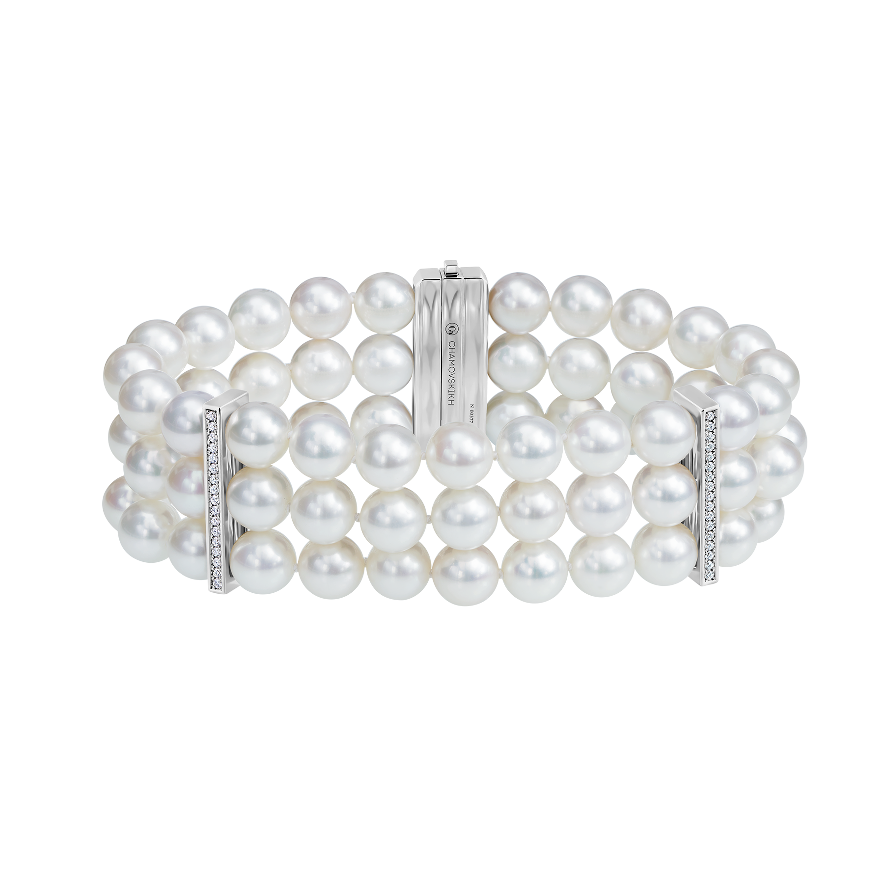 Жемчужный браслет — классический элемент аристократического образа, выбор королевских особ и кинозвезд, актуальный как в контексте делового дресс-кода, так и светского раута. В интерпретации CHAMOVSKIKH 66 белых жемчужин, идеально подобранных по размеру, оттенку и форме, дополняют 85 превосходных бриллиантов.