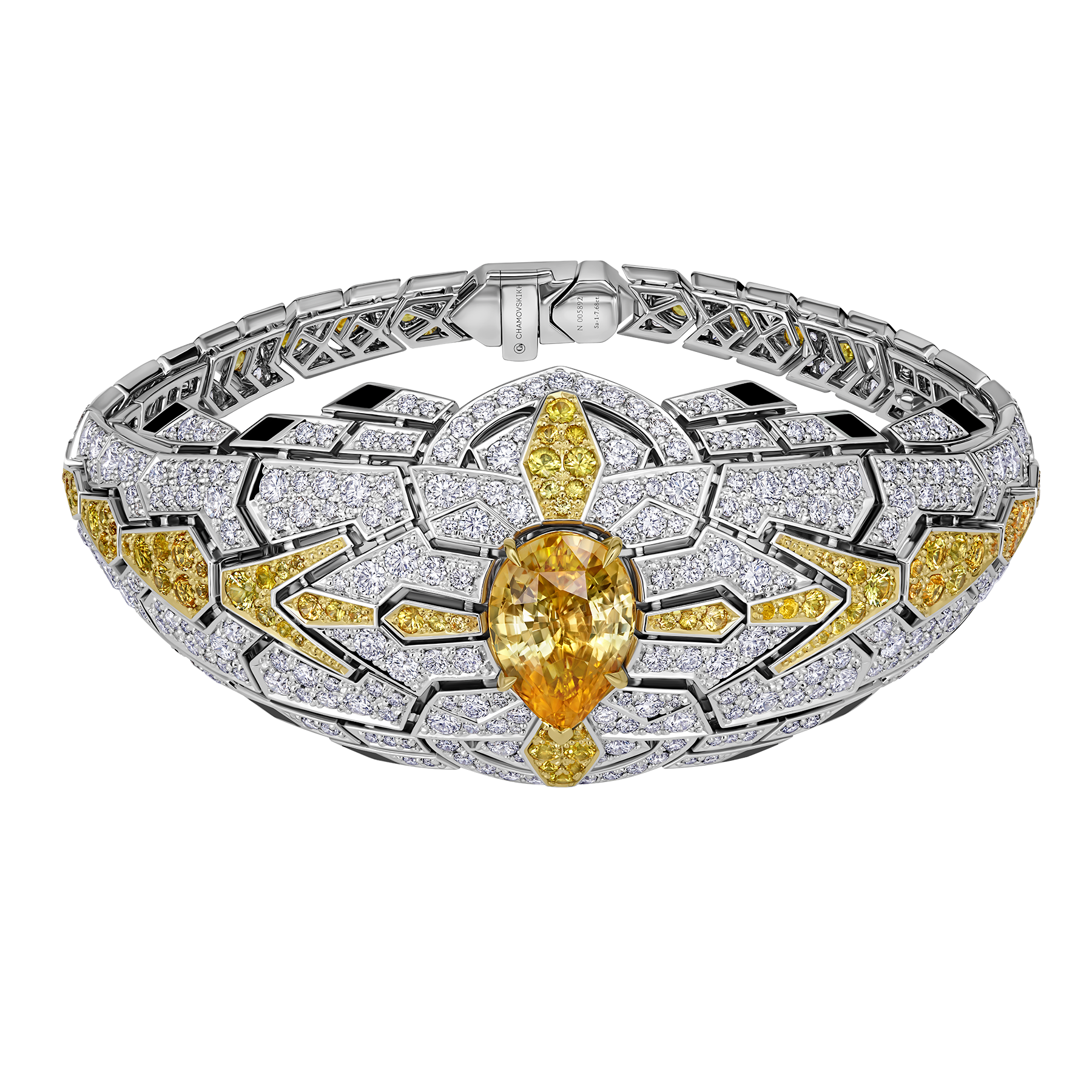 Невероятно эффектная композиция браслета «Мерлион» вдохновлена символом Сингапура, мифическим полульвом-полурыбой. Первый образ олицетворяет силу и отвагу, второй — передает тесную связь Сингапура и моря. В украшении соединились технологичность, динамика азиатского мегаполиса, экзотичность и связь с традициями. В центре браслета – солнечный сапфир огранки «груша» 7,68 ct. Роскошный геометричный орнамент с инкрустацией 351 бриллиантом, 101 желтым сапфиром и контрастной черной керамикой создает незабываемый образ.