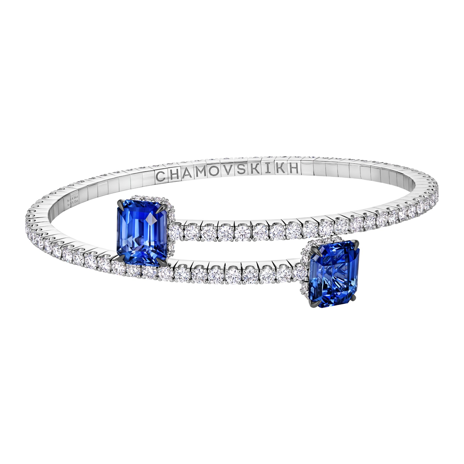 Браслет разомкнутой формы из классической коллекции инкрустирован 115 бриллиантами и двумя сапфирами общим весом 7, 88 ct. Драгоценные камни являются главным акцентом композиции и создают выразительный контраст. Магнетически притягательный чувственный дизайн украшения, плавные изгибы и изысканные линии подчеркивают эстетику каждой детали аксессуара.
