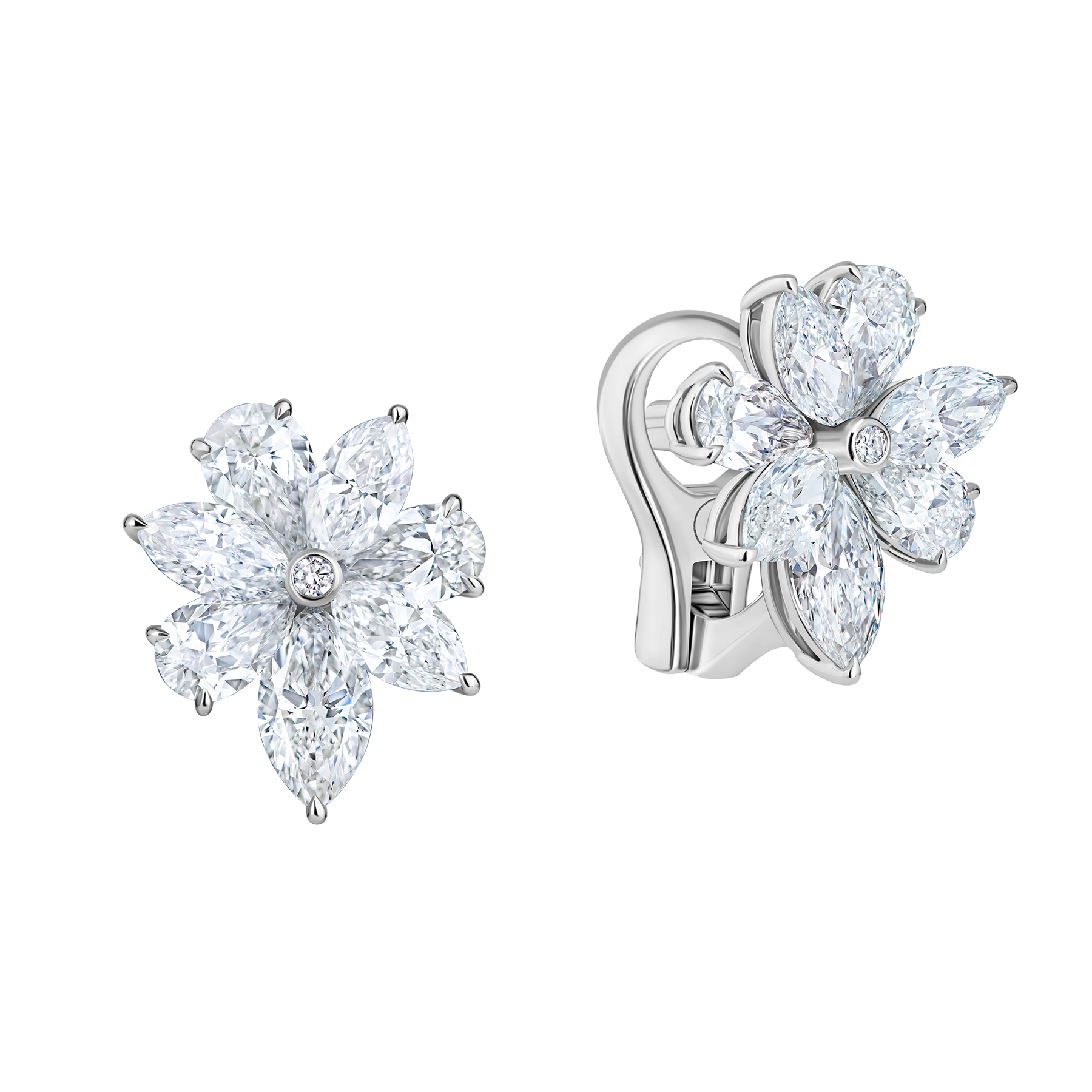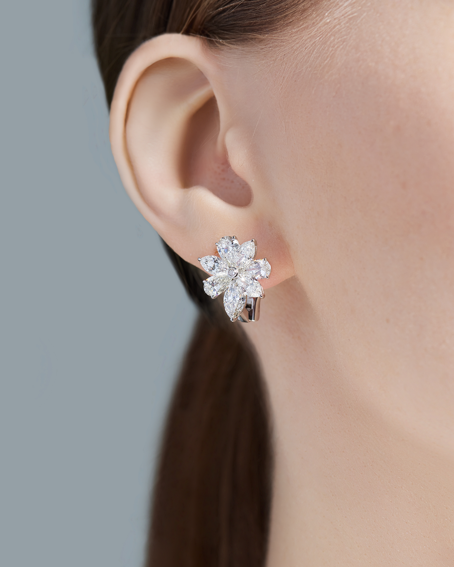 В серьгах с флористическим дизайном заключена изысканная элегантность. Ослепительное сияние 16 бриллиантов фантазийных огранок «маркиз» и «груша» общим весом 4,4 ct рождает эффектный драгоценный калейдоскоп.