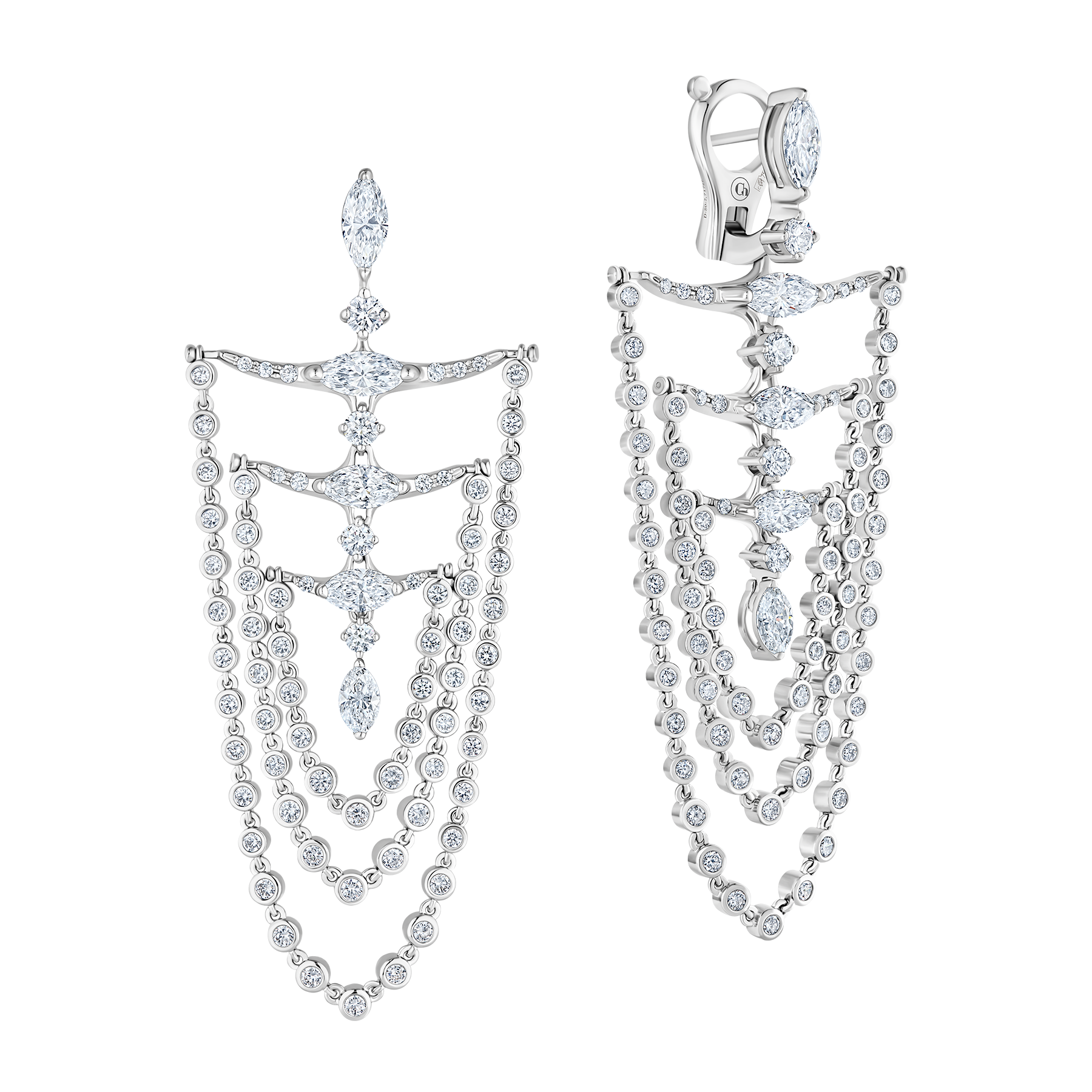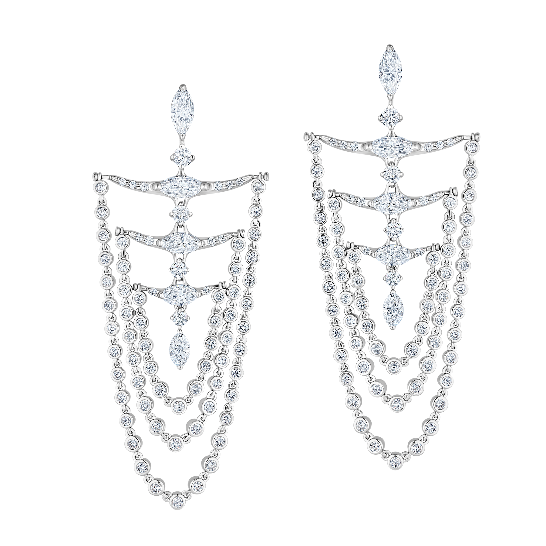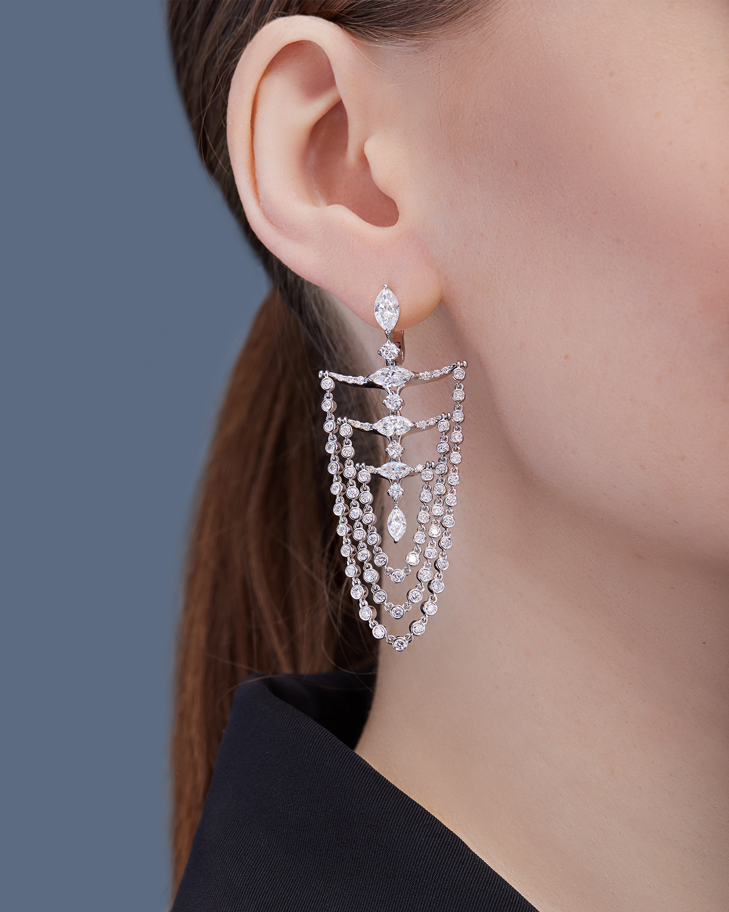 Серьги-шандельеры из коллекции NeoCity завораживают грациозным движением подвесных элементов, рождающим сияющий танец драгоценных искр. Десять великолепных бриллиантовых «маркизов» дополняет игра 146 превосходных камней. Statement-украшение станет эффектным завершением вечернего образа или ярким акцентом в стиле casual chic