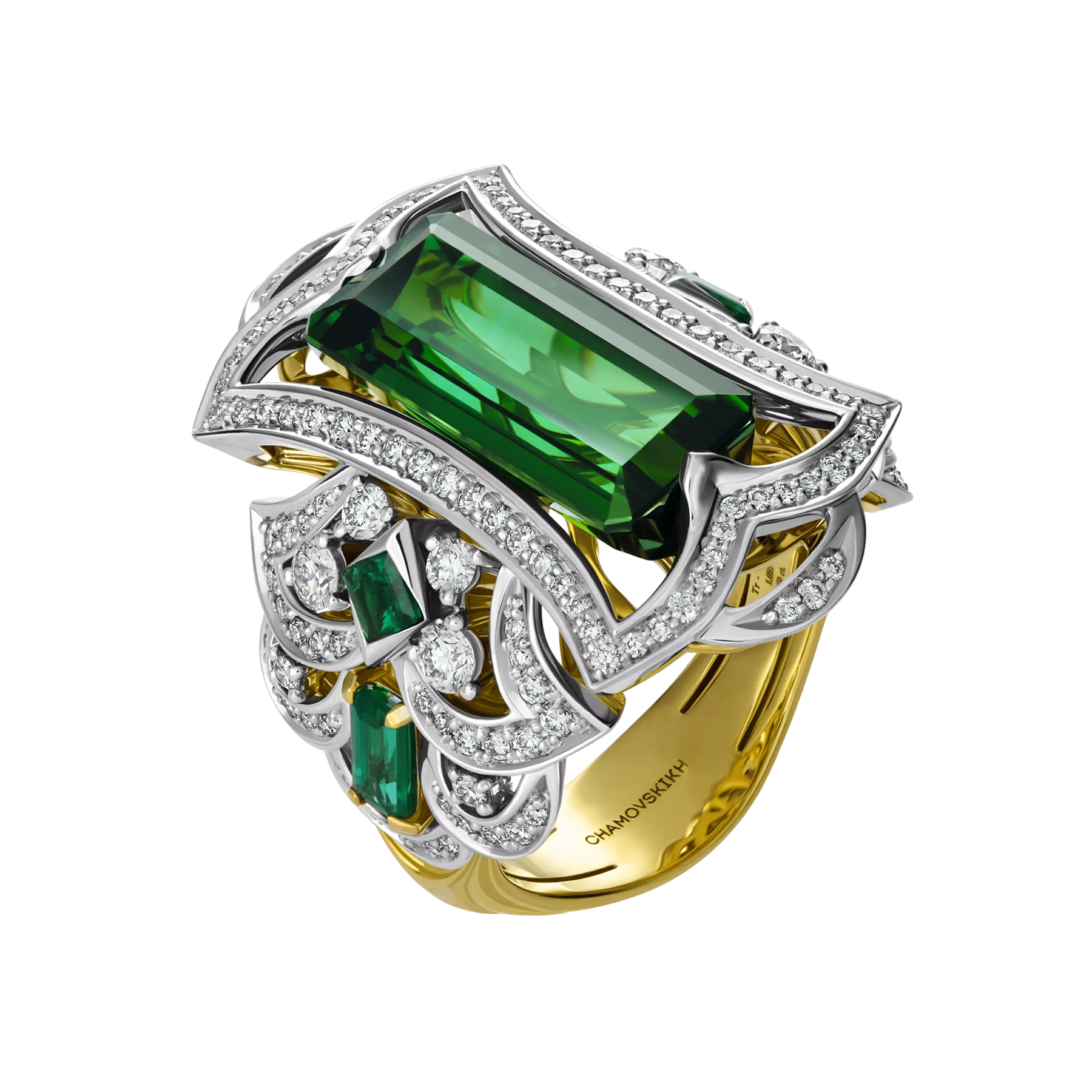 Для кольца из коллекции Discovery мастера CHAMOVSKIKH выбрали дизайн с элементами вьетнамской архитектуры, соединившей французский и восточный стили. Очертания украшения напоминают очаровательные храмы-пагоды. 148 бриллиантов и 4 изумруда аккомпанируют природному совершенству турмалина верделита 7,5 ct. Белое золото добавляет кольцу легкости и стиля, желтое символизирует солнечность и жизнерадостность Вьетнама.