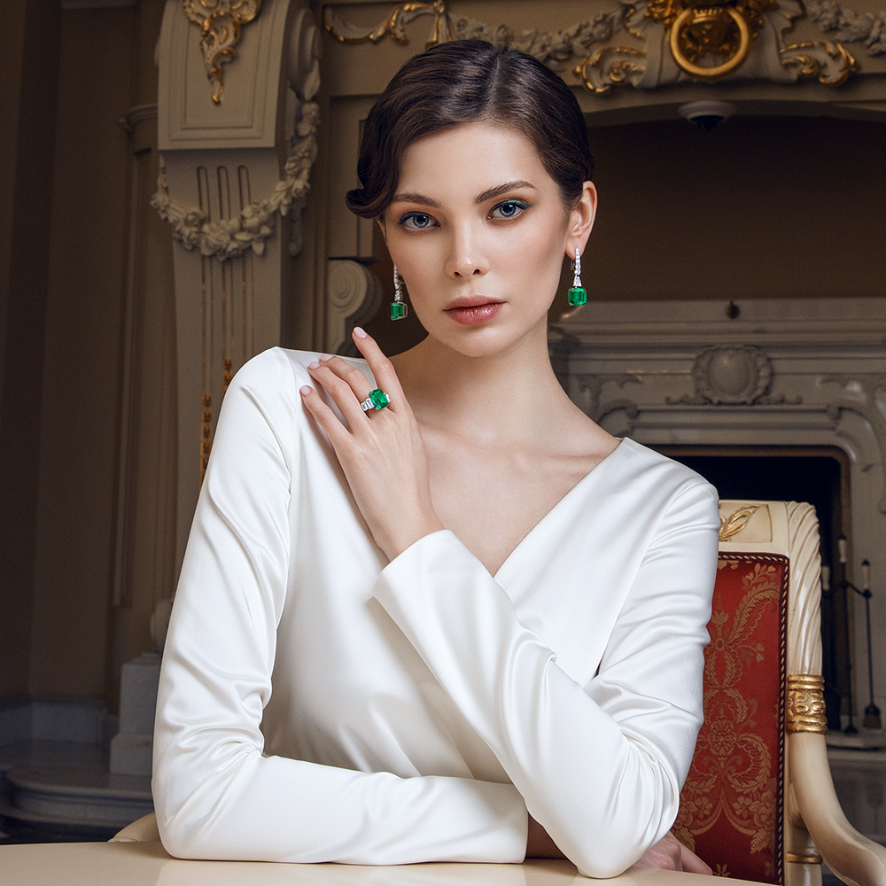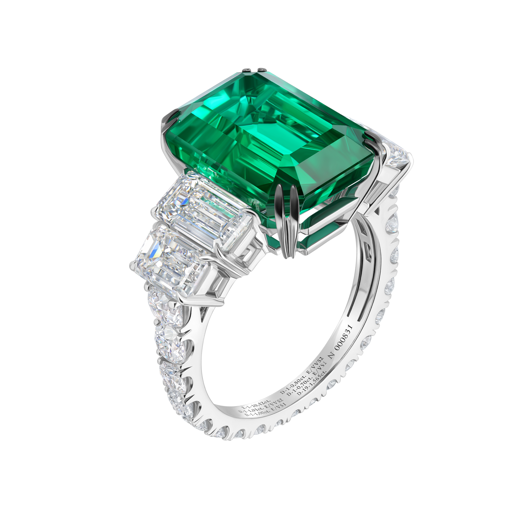 Превосходный замбийский изумруд 18.4 ct сияет в центре геометричного кольца из коллекции CHAMOVSKIKH Royal Jewellery. Классическая для изумруда огранка раскрывает завораживающие оптические свойства драгоценного камня и демонстрирует его эталонный цвет Vivid Green. Четыре бриллианта Emerald cut и 19 бриллиантовых «кругов» завершают безупречную композицию украшения, обладающего высоким инвестиционным потенциалом.
