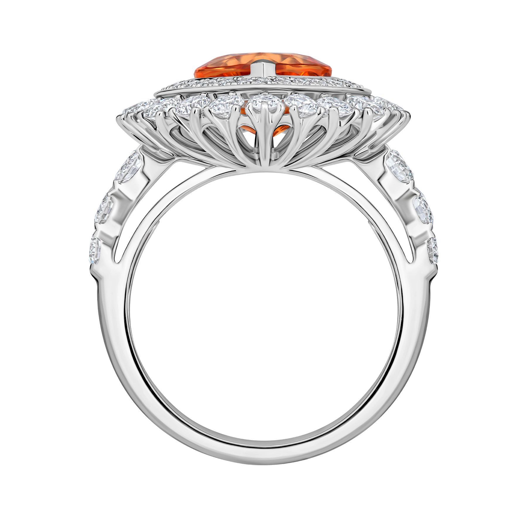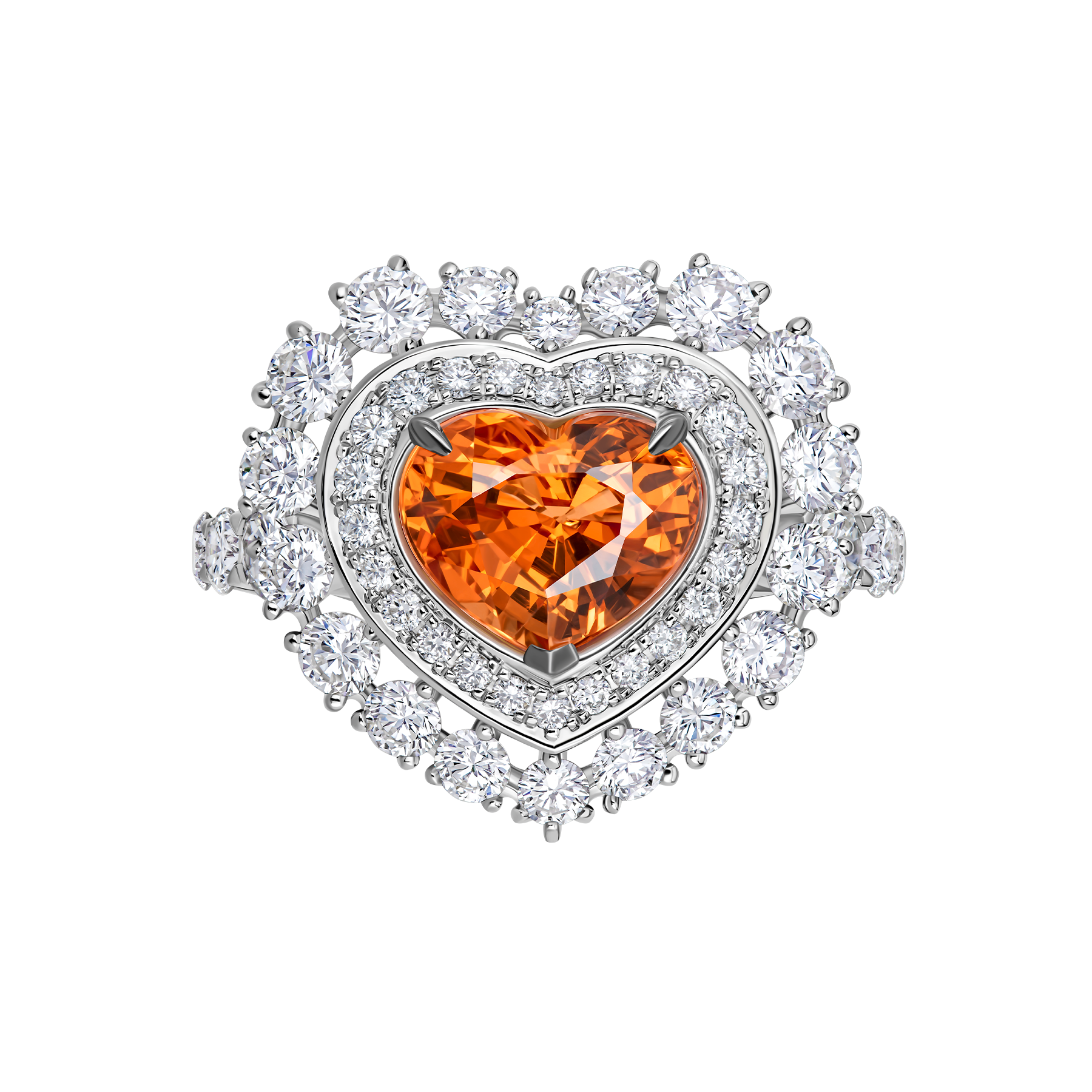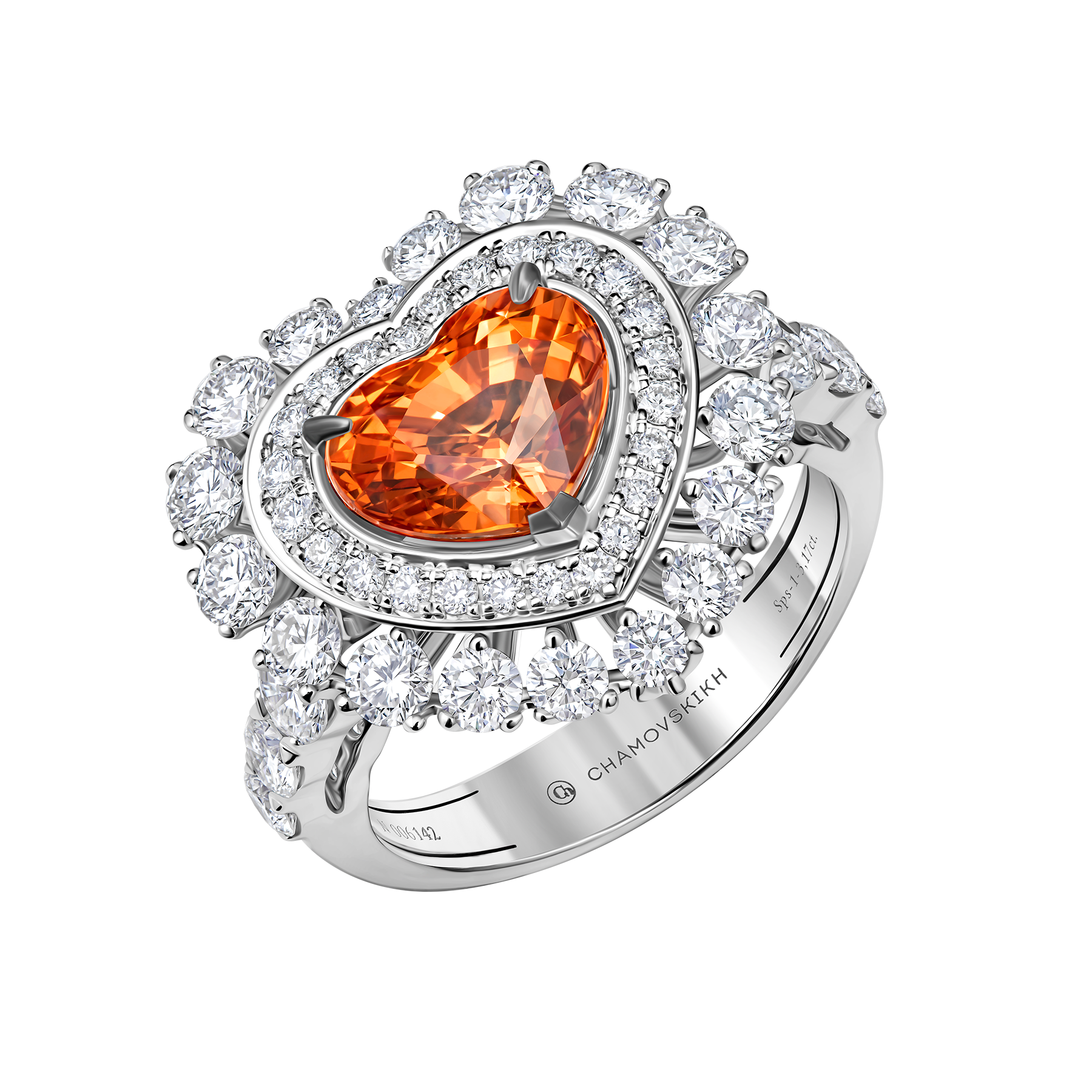 В изящном кольце яркий спессартин 3,17 ct в огранке «сердце» покоряет взор насыщенно-оранжевым цветом. Его сияние усиливает двойной ореол − 48 превосходных бриллиантов общей кратностью 2,07 ct «парят» вокруг оранжевого самоцвета благодаря изящной конструкции из белого золота. Украшение станет чувственным акцентом классического образа, а в сочетании с серьгами создаст эффектный сет для вечернего выхода.