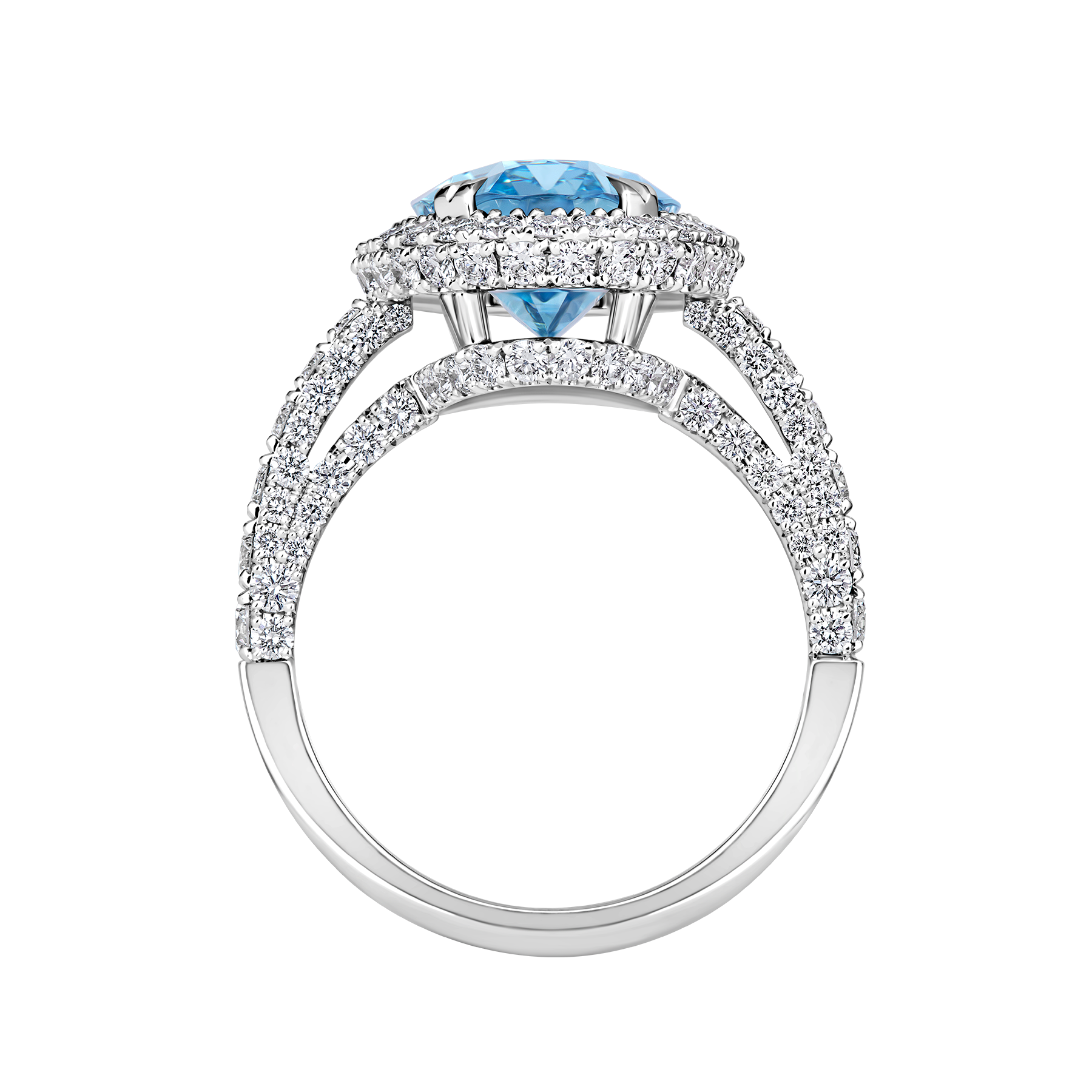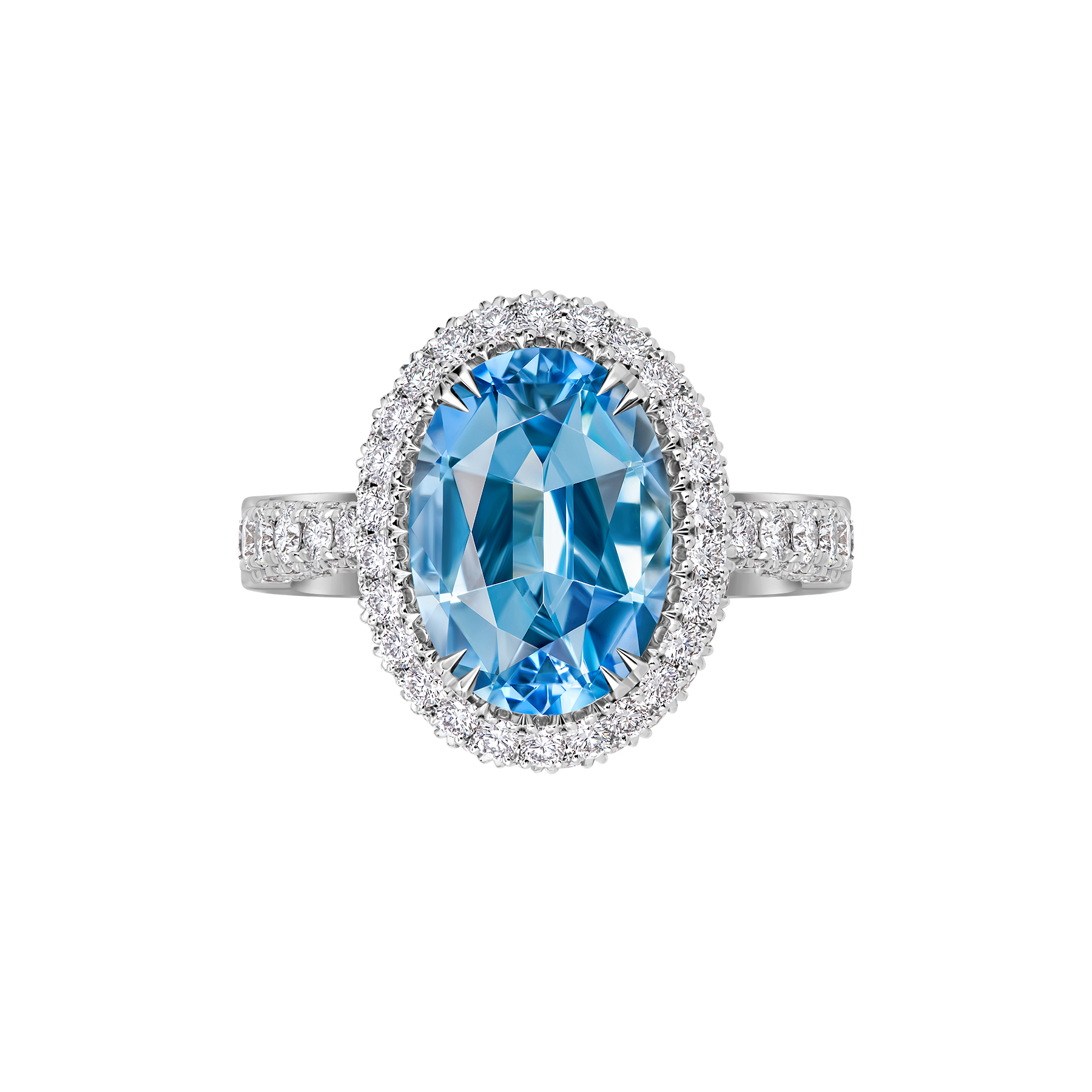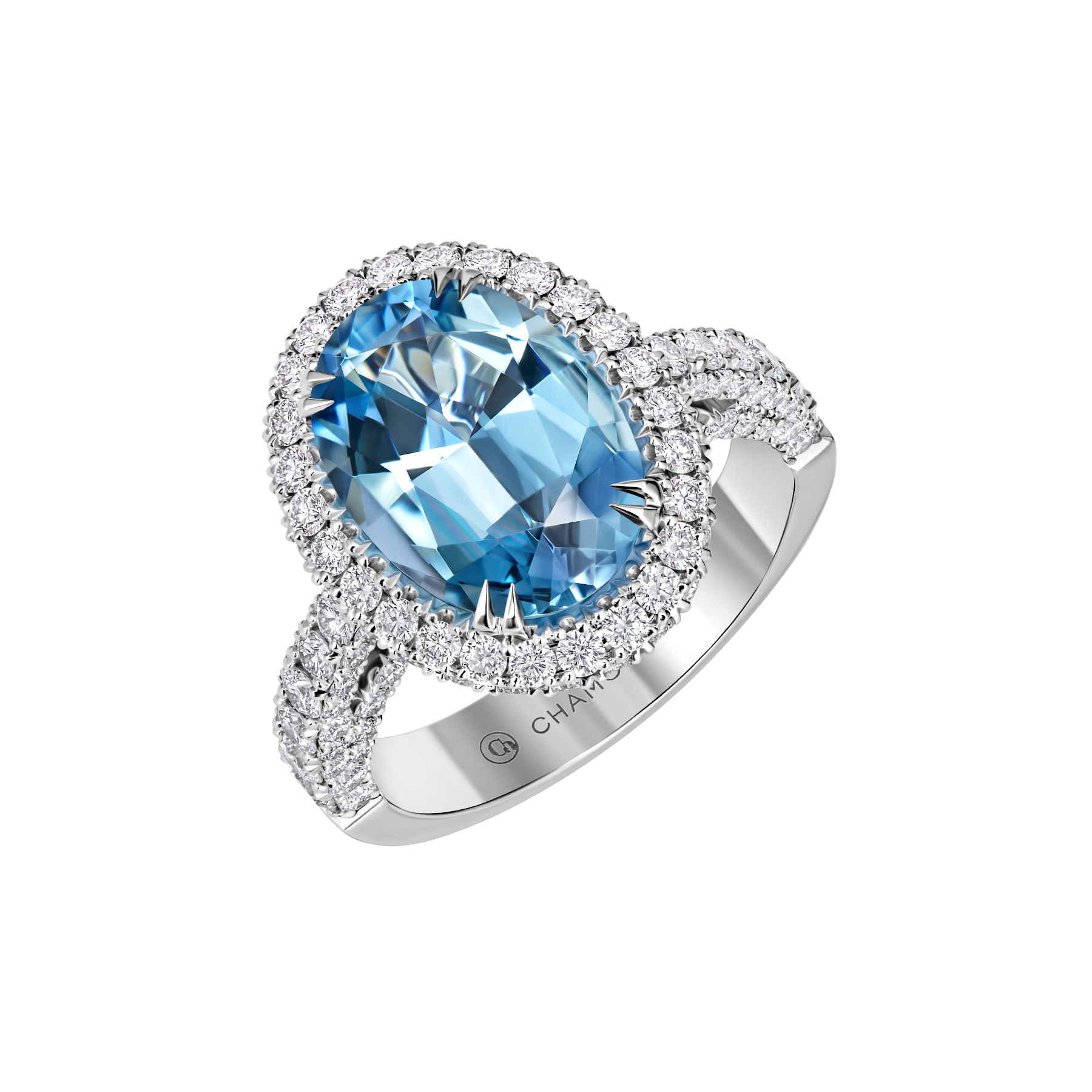 Классическое кольцо с аквамарином весом 3,58 ct воплощает образ утонченного очарования. Элегантная овальная форма самоцвета раскрывает безмятежный, словно морская гладь, голубой оттенок. Инкрустация из 144 бриллиантов придает композиции исключительное сияние.