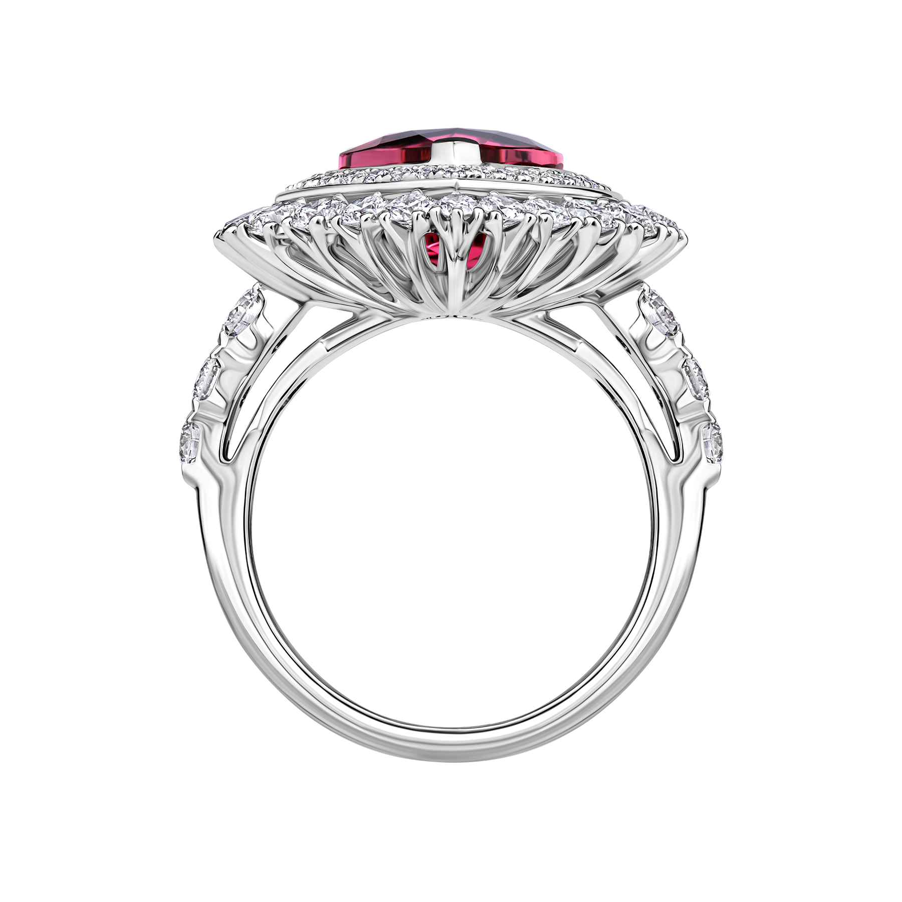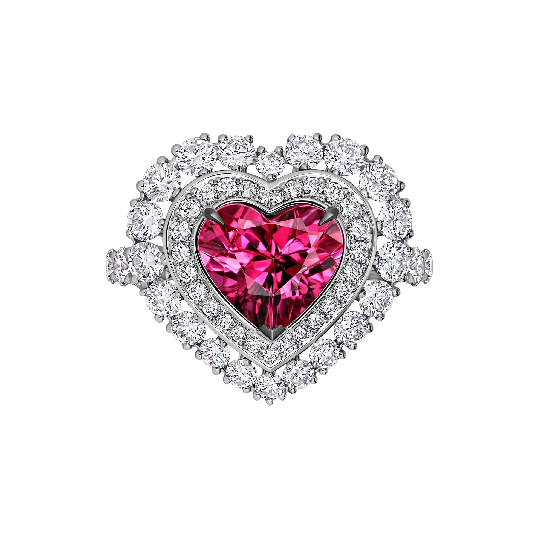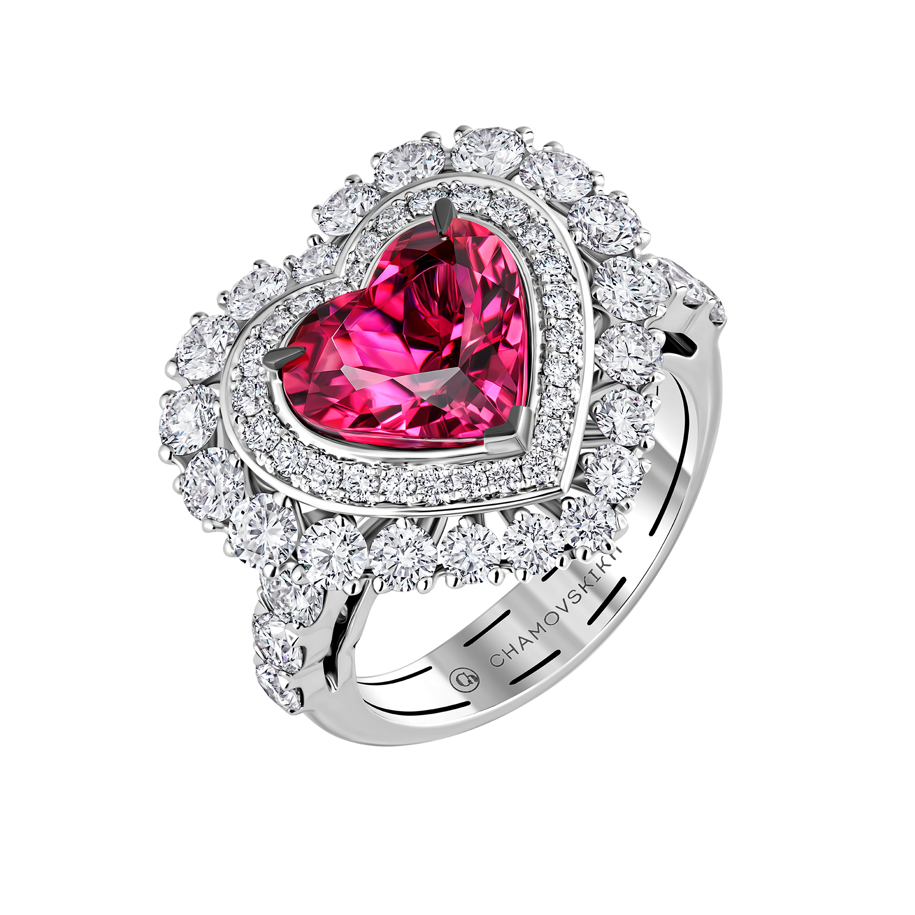 В изящном кольце яркий турмалин рубеллит 2,75 ct в огранке «сердце» покоряет взор насыщенно-алым цветом. Его сияние усиливает двойной ореол − 53 превосходных бриллиантов общей кратностью 2,13 ct «парят» вокруг самоцвета благодаря изящной конструкции из белого золота. Украшение станет чувственным акцентом классического образа или вечернего аутфита.