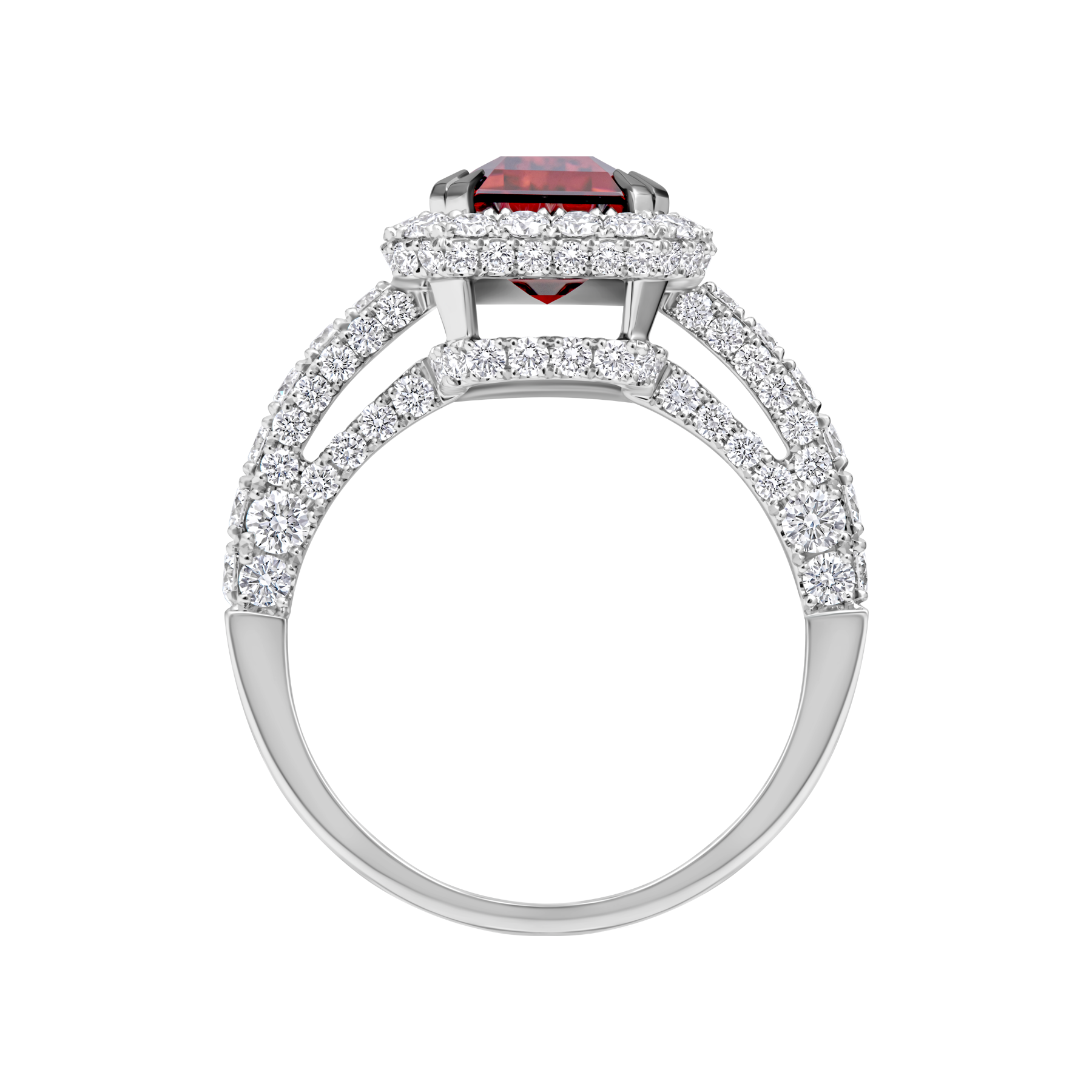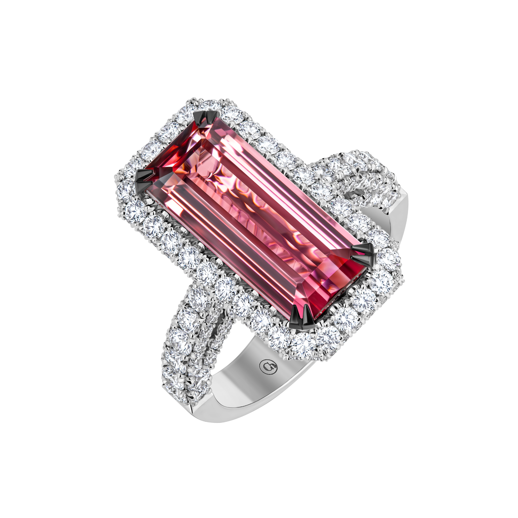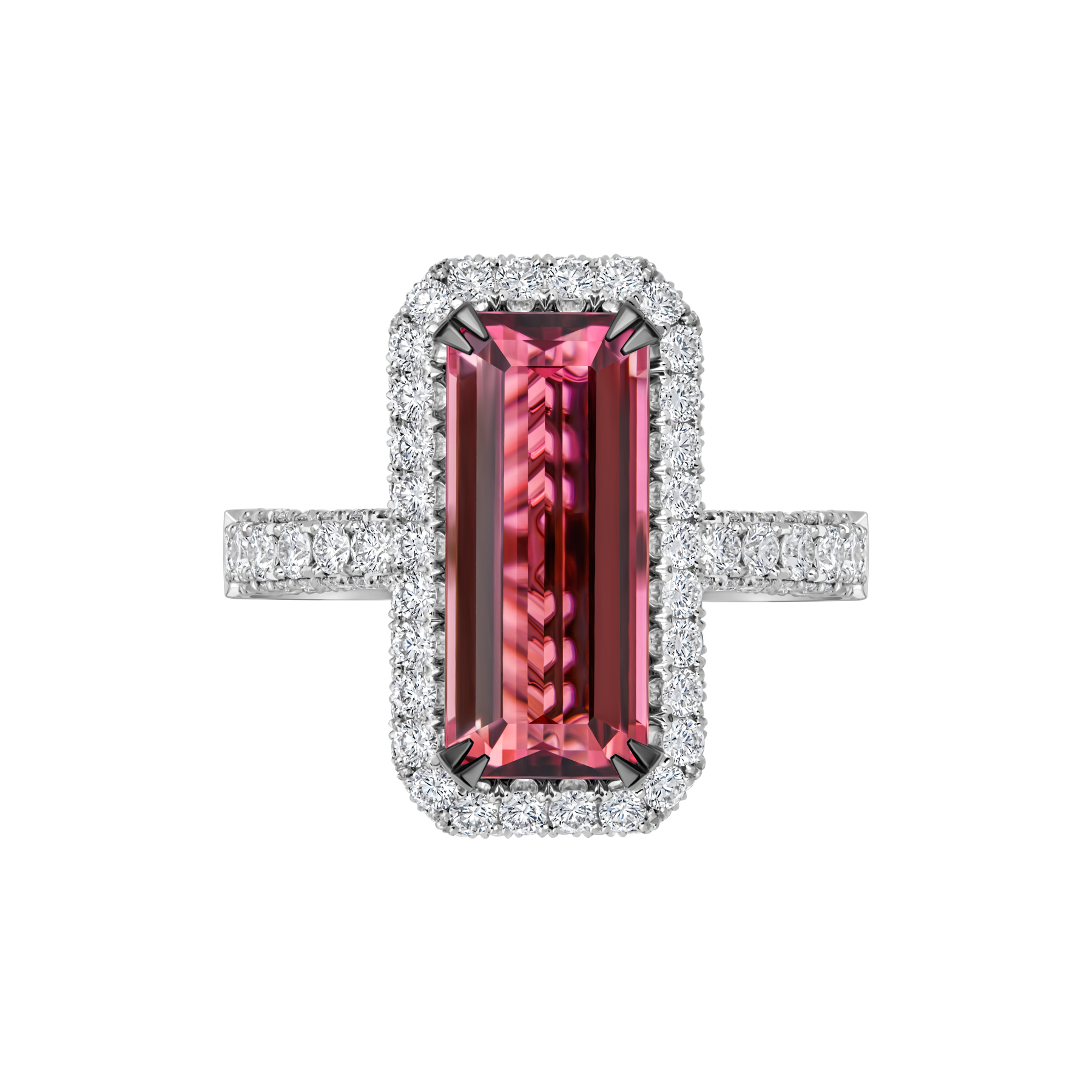В классическом кольце сияет турмалин рубеллит чарующего розового оттенка 5,82 ct огранки «октагон». 162 бриллианта в инкрустации придают композиции дополнительный блеск.