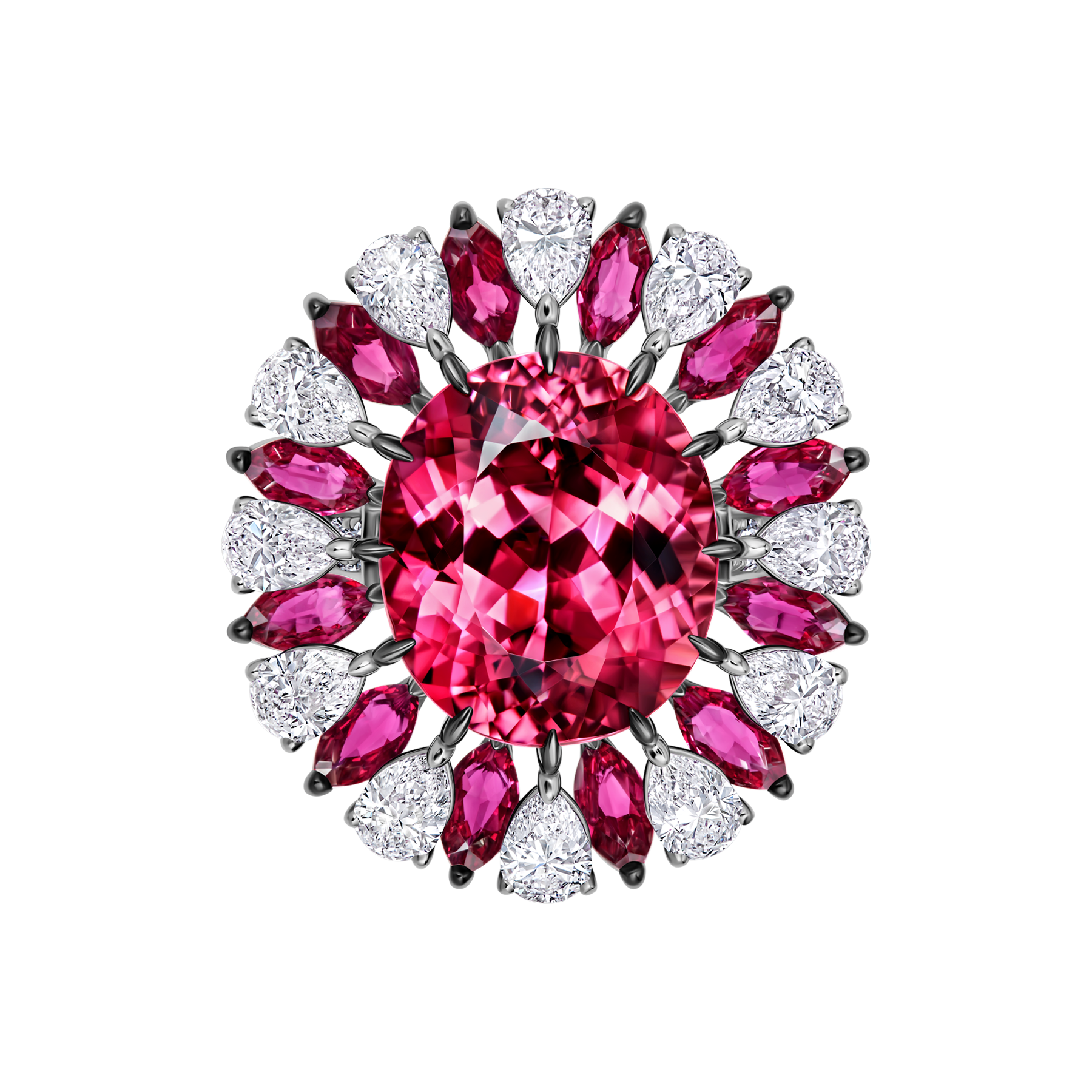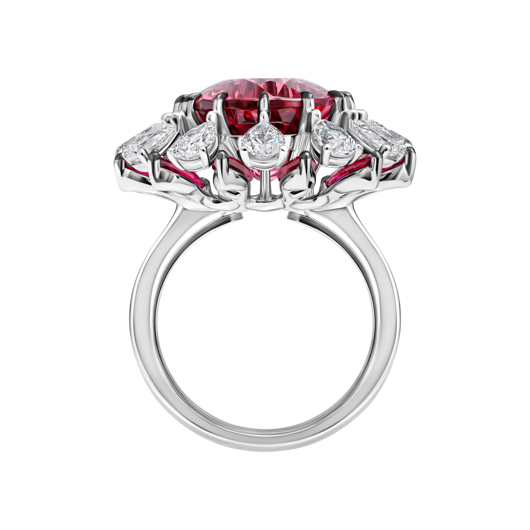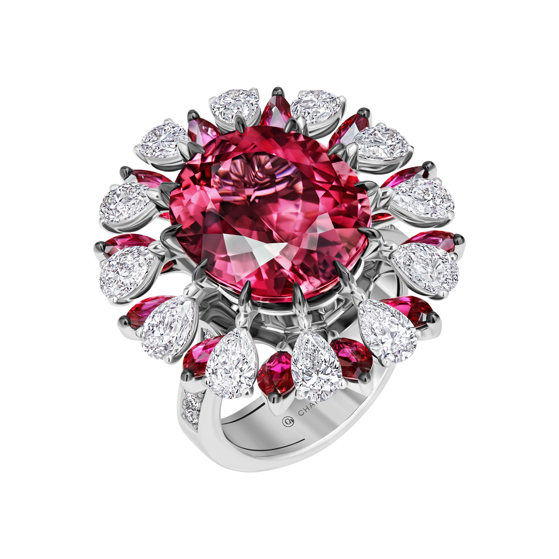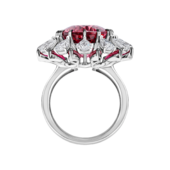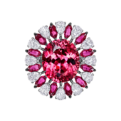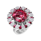 В кольце Rosetta главную роль играет роскошный рубеллит превосходных характеристик. Насыщенно-красный самоцвет 10,74 ct эффектно дополнен мерцающими бриллиантами и рубинами. Чтобы подчеркнуть природное очарование самоцвета, художники CHAMOVSKIKH воспроизвели в украшении изящные очертания орнамента «розетта». Драгоценные камни интерпретируют растительный мотив, в виде лепестков распустившегося цветка, одинаковых по форме и расположенных абсолютно симметрично друг к другу. Такой прием создает контрастное цветовое сочетание и выразительные, объемные формы.