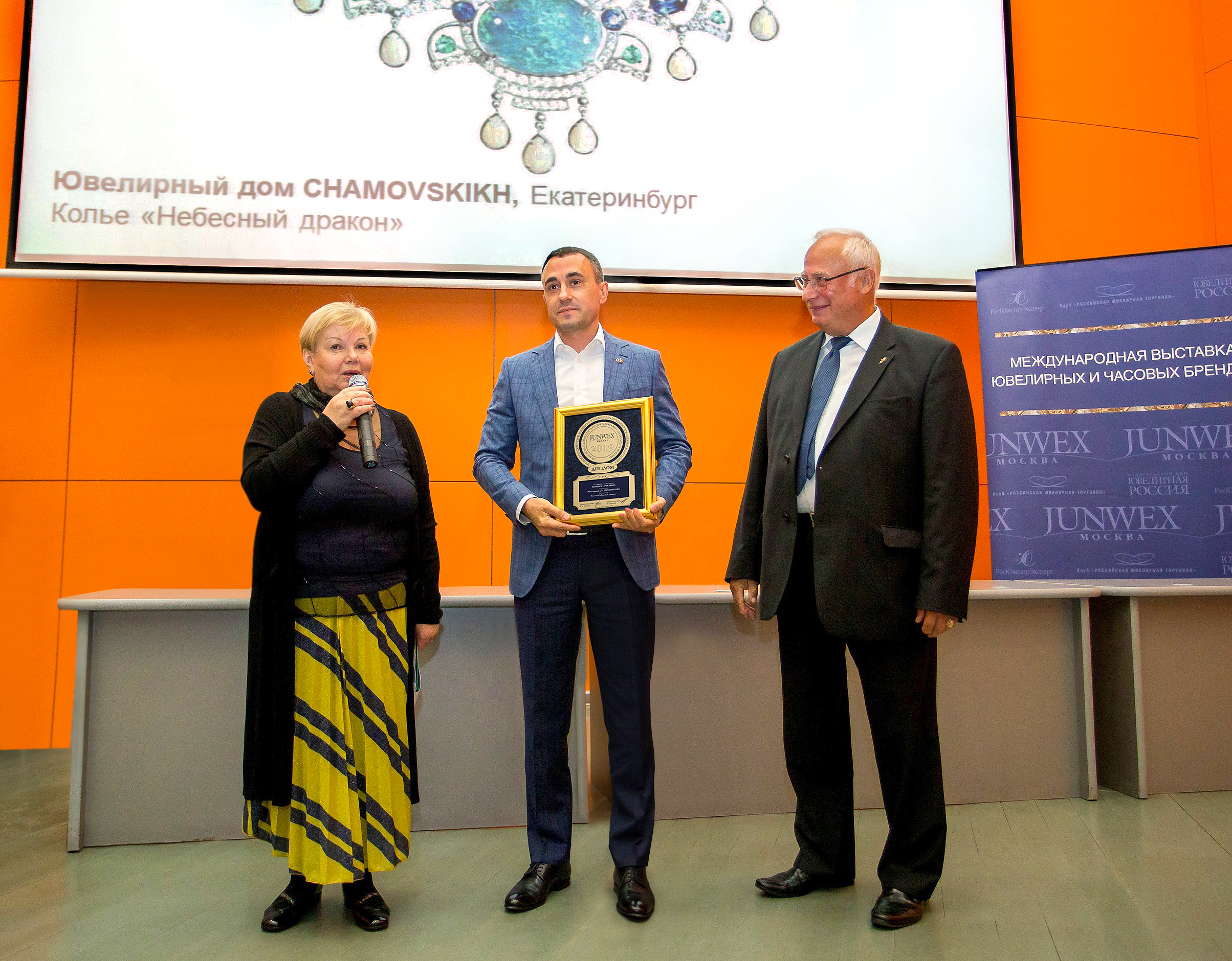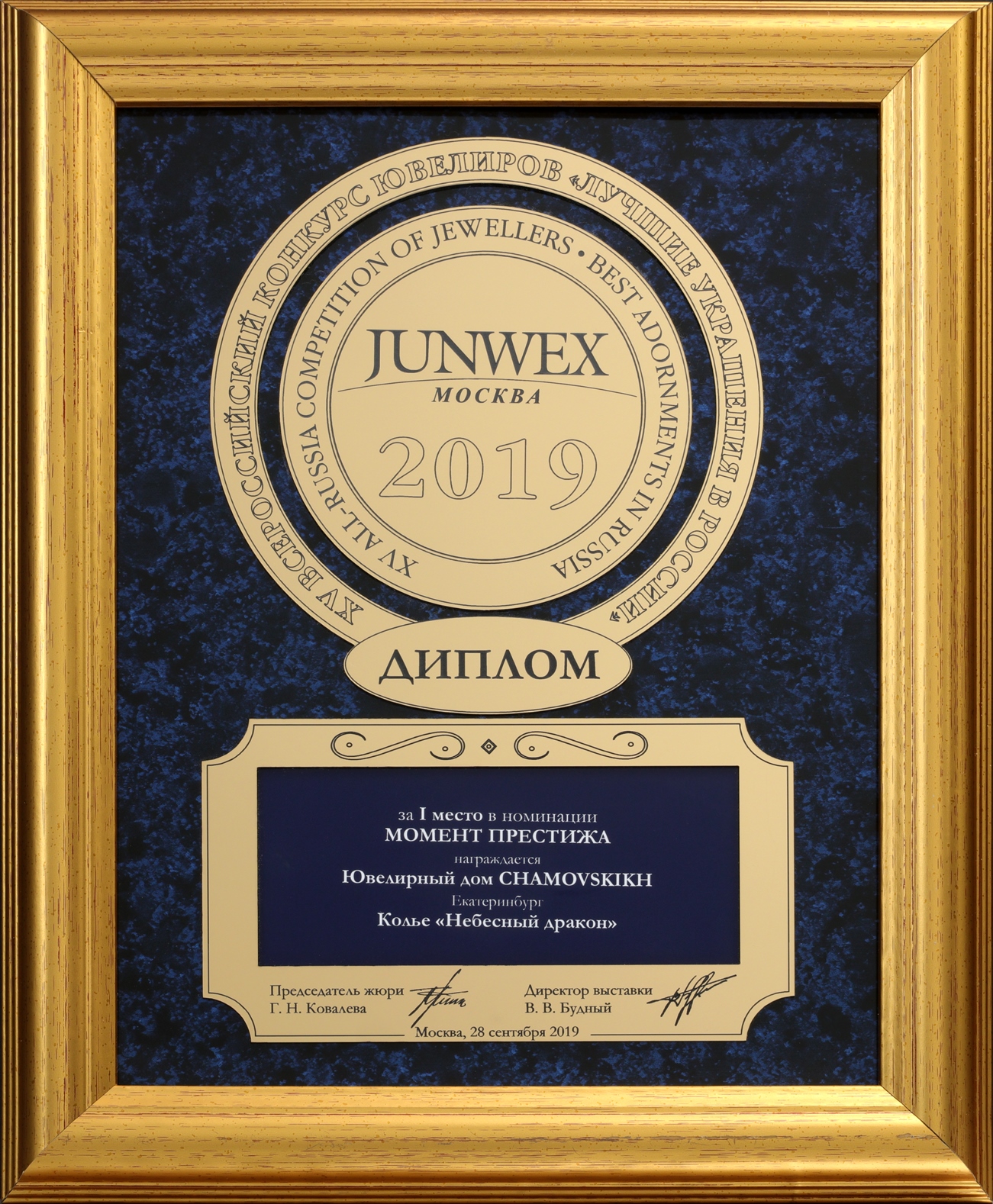 По итогам конкурса на международной выставке ювелирных и часовых брендов JUNWEX ювелирный дом CHAMOVSKIKH завоевал первое место. Колье «Небесный дракон» стало лучшим в номинации «Момент престижа». Профессиональное жюри впечатлил эффектный дизайн, который подчеркнул красоту редкого австралийского опала, виртуозная проработка деталей и свойство трансформации украшения.
