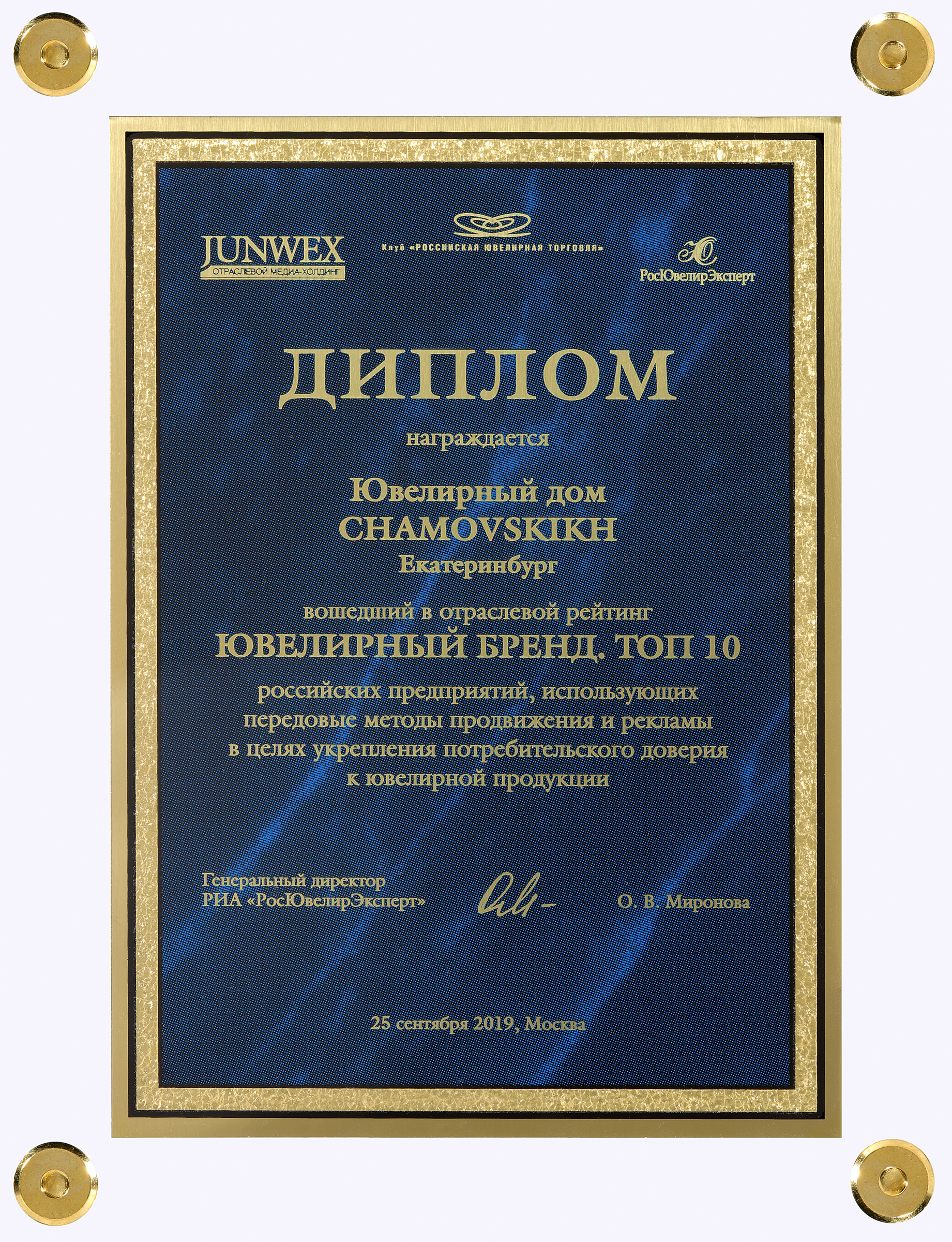 Ювелирный дом CHAMOVSKIKH вошел в Топ-10 ювелирных брендов России. Профильное агентство «РосЮвелирЭксперт» отметило CHAMOVSKIKH за передовые методы продвижения, а также за высокие оценки и доверие ценителей ювелирного искусства.