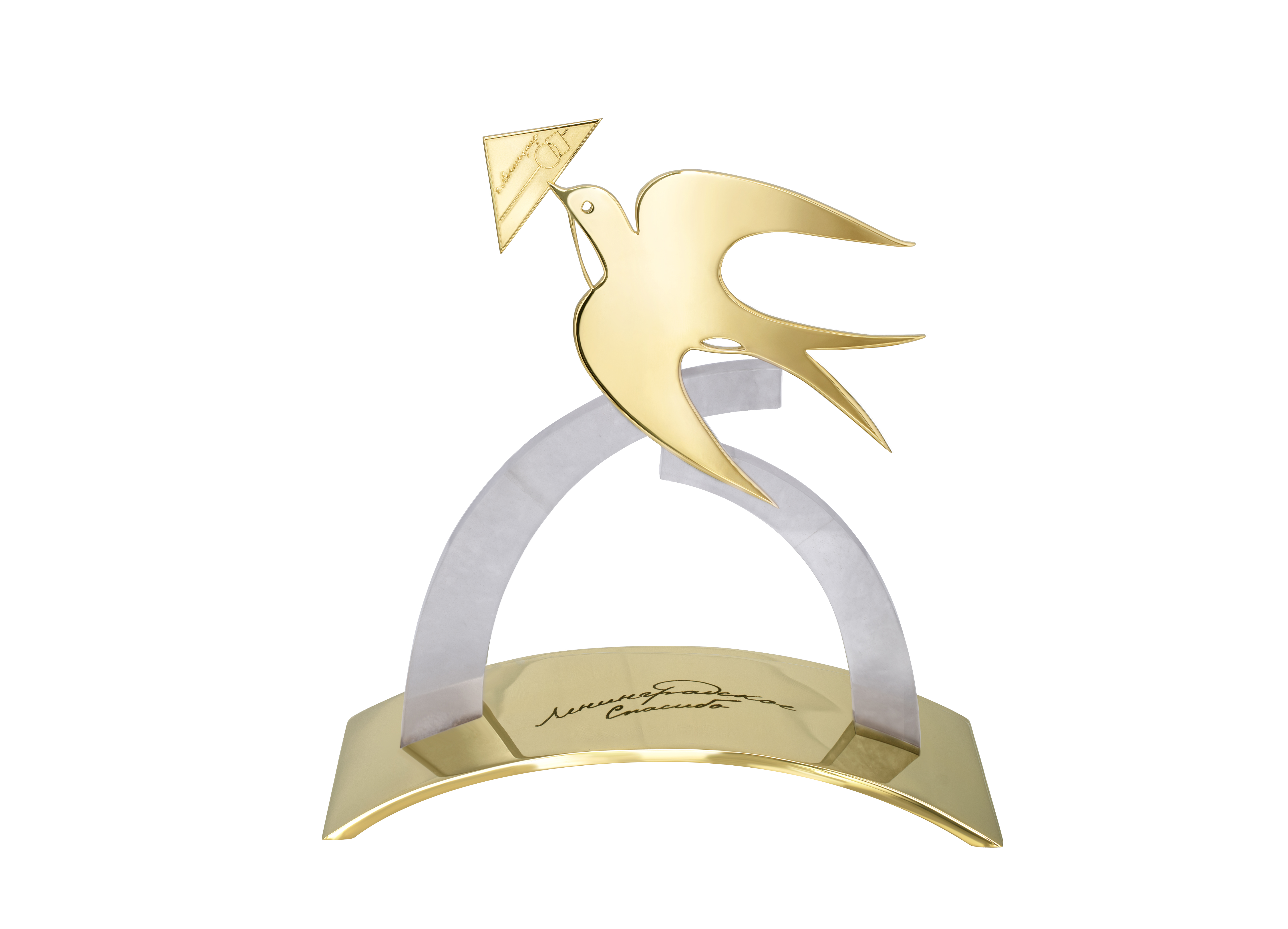 В этот же вечер организаторы отправили в символический полет «Блокадную ласточку». Изображение птицы с треугольным письмом весной 1942-го года ленинградцы носили на лацкане как знак надежды на связь с Большой землей. Именно этот образ воплощен в переходящей памятной статуэтке. Скульптура «Блокадной ласточки» выполнена из льдистого кварца и металла, покрытого золотом 999-й пробы. Символ проекта создан по эскизу петербургской художницы Надежды Протопоповой ювелирами CHAMOVSKIKH в Екатеринбурге. Отметим, что в годы Великой отечественной войны уральский город стал вторым домом для тысяч эвакуированных ленинградцев и промышленных предприятий Северной столицы.